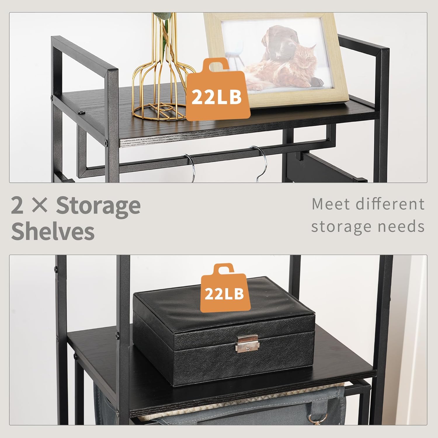 - Great All-in-one Storage Shelf! The organization shelf with laundry hamper, clothes rack, 4 movable metal hooks and hanging rods, makes it is a great shelf organizer in laundry room, coat rack in bedroom, hall tree in entryway and living room