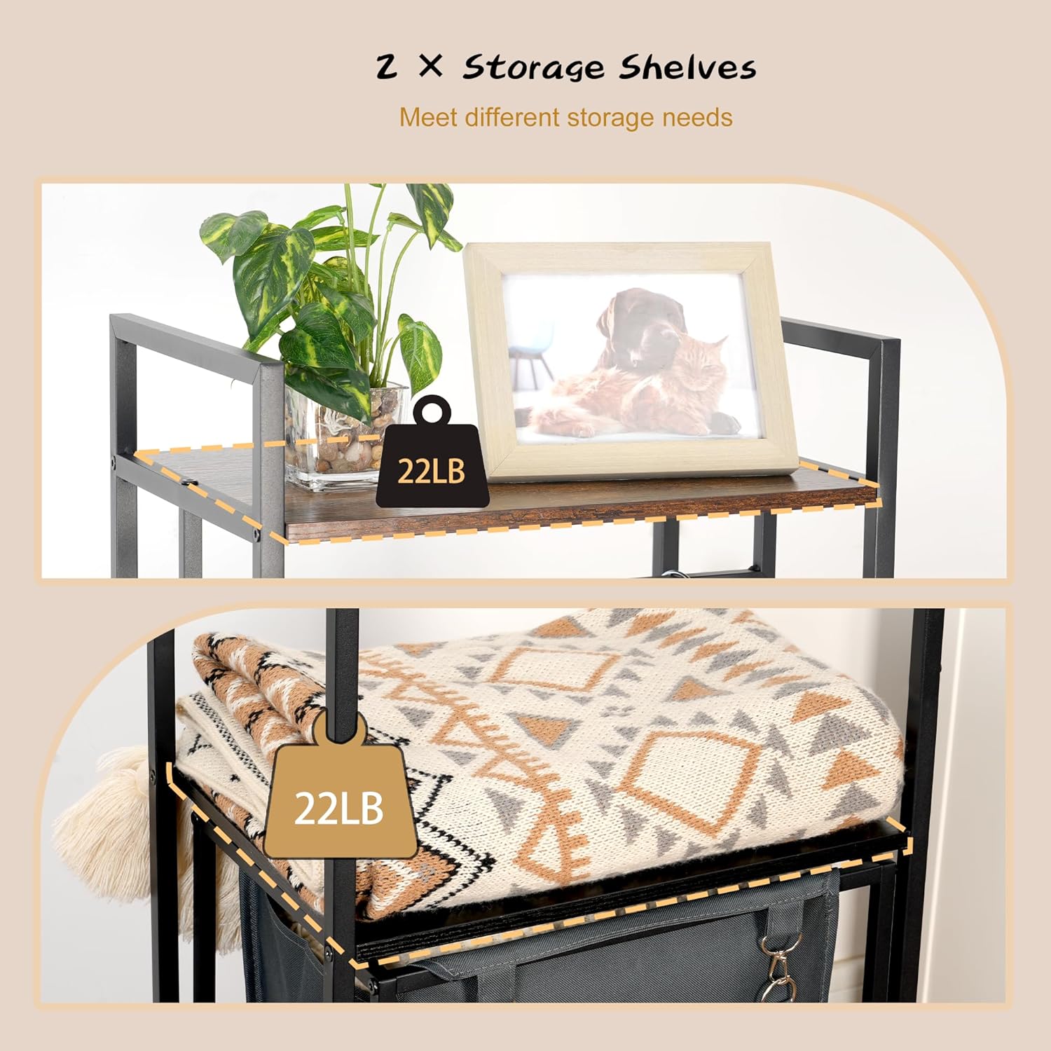 - Great All-in-one Storage Shelf! The organization shelf with laundry hamper, clothes rack, 4 movable metal hooks and hanging rods, makes it is a great shelf organizer in laundry room, coat rack in bedroom, hall tree in entryway and living room