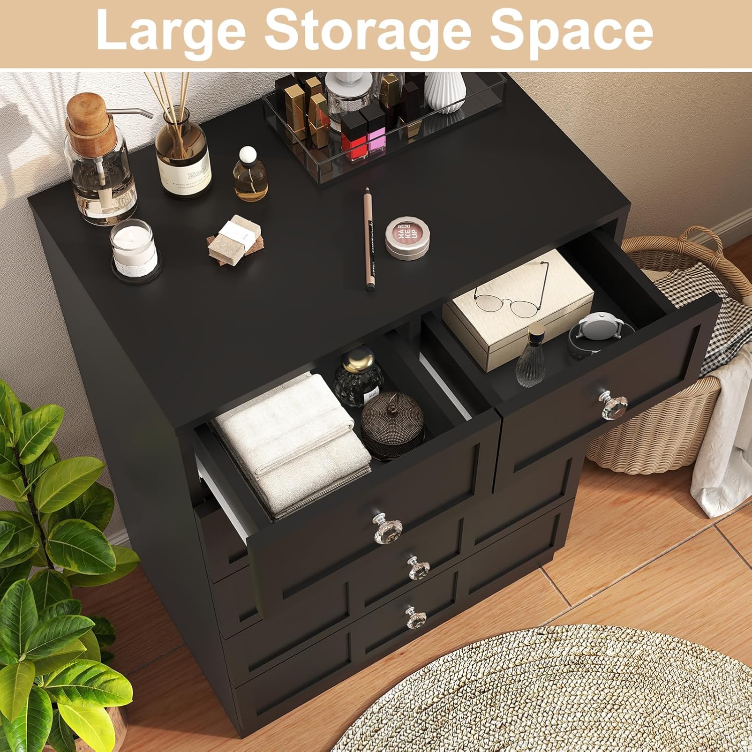 - Premium Materials Crafted for lasting quality, our 6 drawer black dresser for bedroom features high-grade engineered wood with a specially treated surface that's scratch-resistant and easy to clean. A simple wipe restores its pristine finish. The fluted 6 drawer dresser showcases crystal knobs that combine elegant design with satisfying tactile feedback, making every use a pleasure.