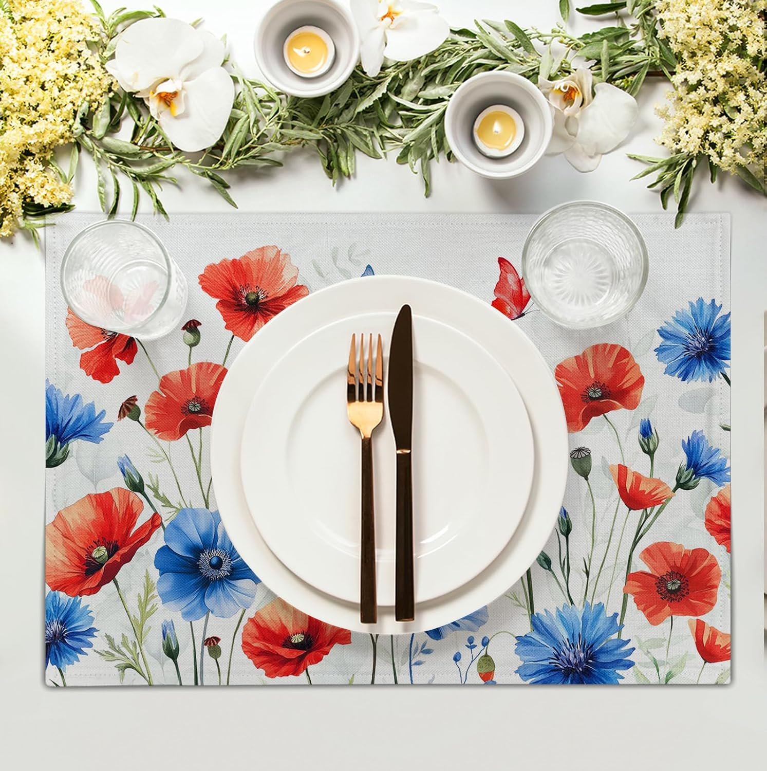 - TABLE DECORATION: 4th of July flowers placemat feature high-definition printing technology for crisp, clear patterns and vibrant colors; rectangle placemats with a flowers pattern; unique and eye-catching seasonal patterns add charm to farmhouse table place mats, creating a independence day atmosphere for your party