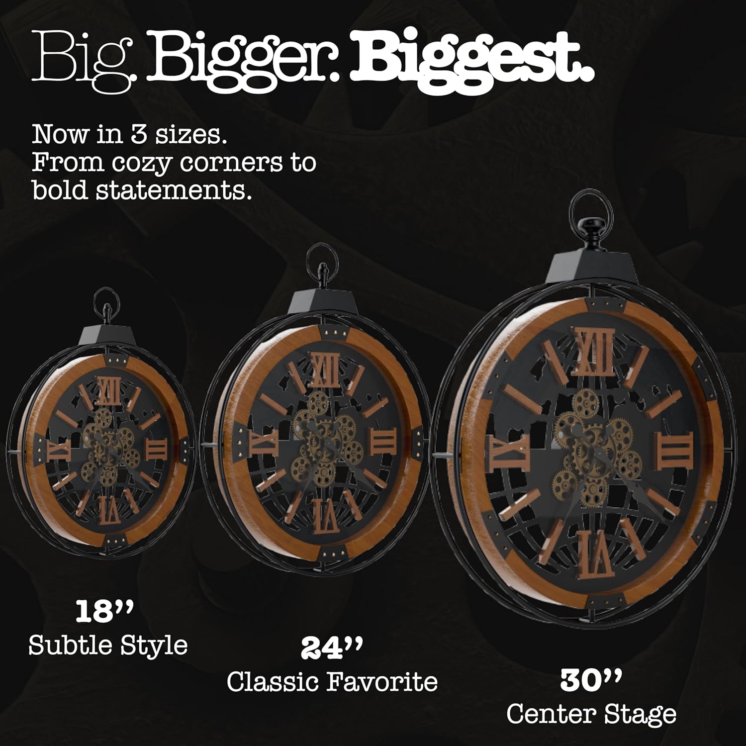 - TIMELESS STYLE: Stay on schedule with your new Driini Large Rustic Wall Clock. This oversized, 18 inch moving gear wall clock features a premium wooden frame, and a decorative black wrought-iron skeleton. The clock face is protected by a HD tempered glass for clear visibility and durability. A big, looped handle on top adds to its aesthetic as an industrial steampunk clock or gothic clock, while also invoking nautical and farmhouse vibes. Hand-cut 3D solid wood Roman numerals and tick marks are individually mounted to ensure visibility from any angle.