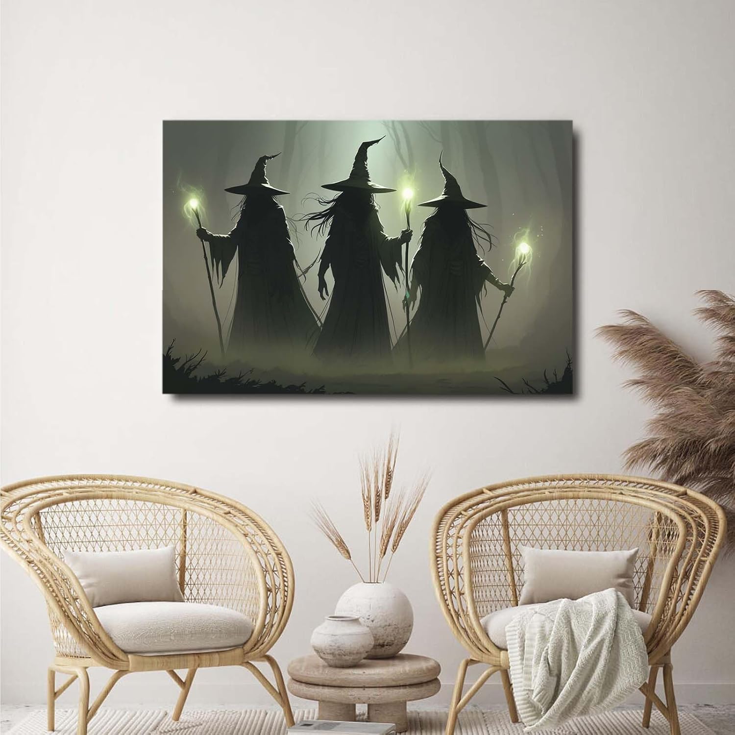 JFHCQJPK Vintage 3 witches canvas wall decor melancholy dark Halloween poster wall decor holding a staff print Gothic horror Halloween painting print for living room bedroom32x48in Frameless