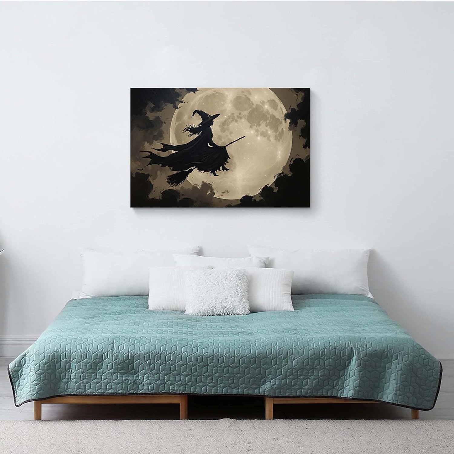 JFHCQJPK Full moon witch silhouette poster witch on magic broom Halloween mural poster decorative mural art suitable for home living room bedroom28x40in Frameless