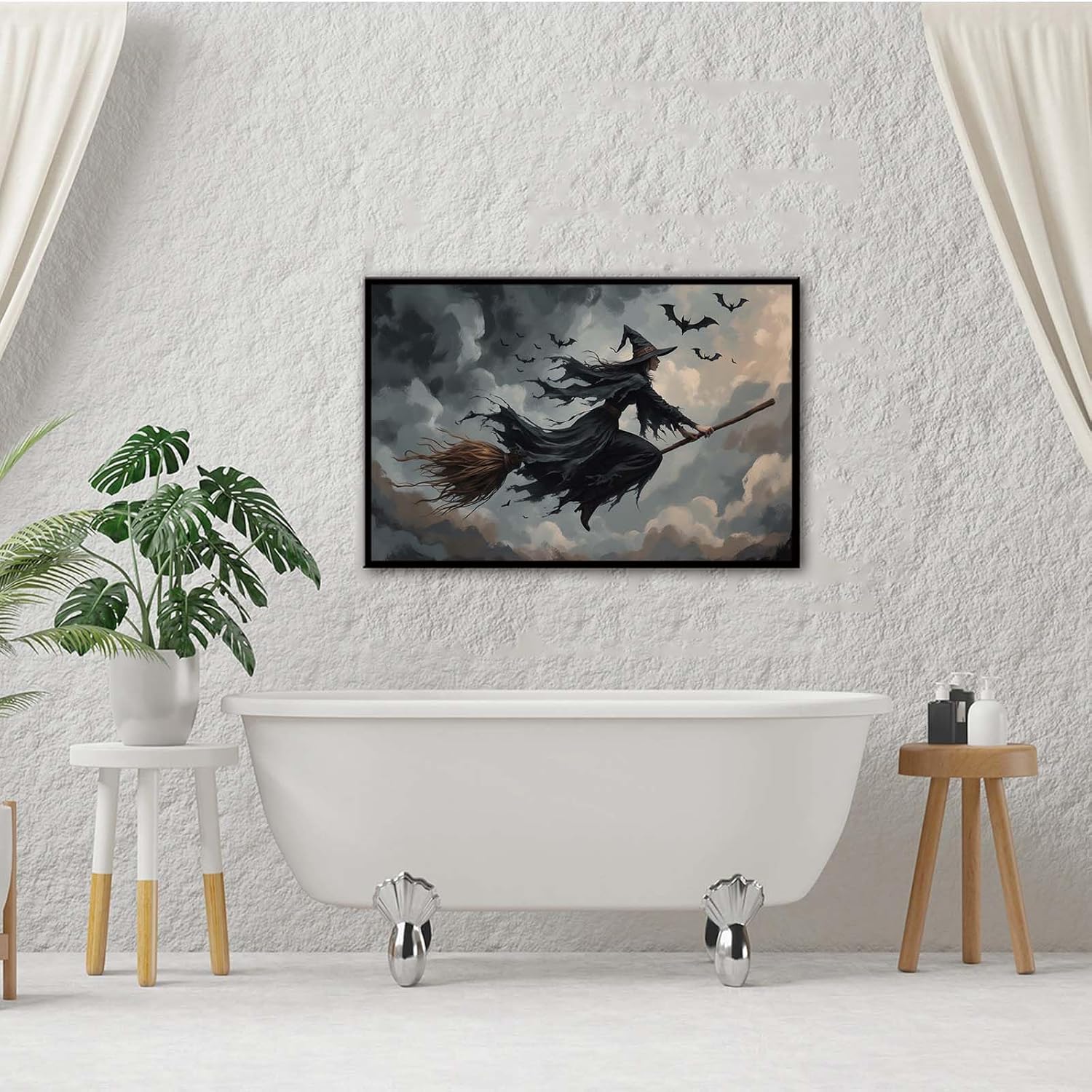 JFHCQJPK Witch and bat flying Halloween poster suitable for home party wall decoration retro Halloween preppy style wall art canvas print suitable for room decoration20x30in Metal blackFramed