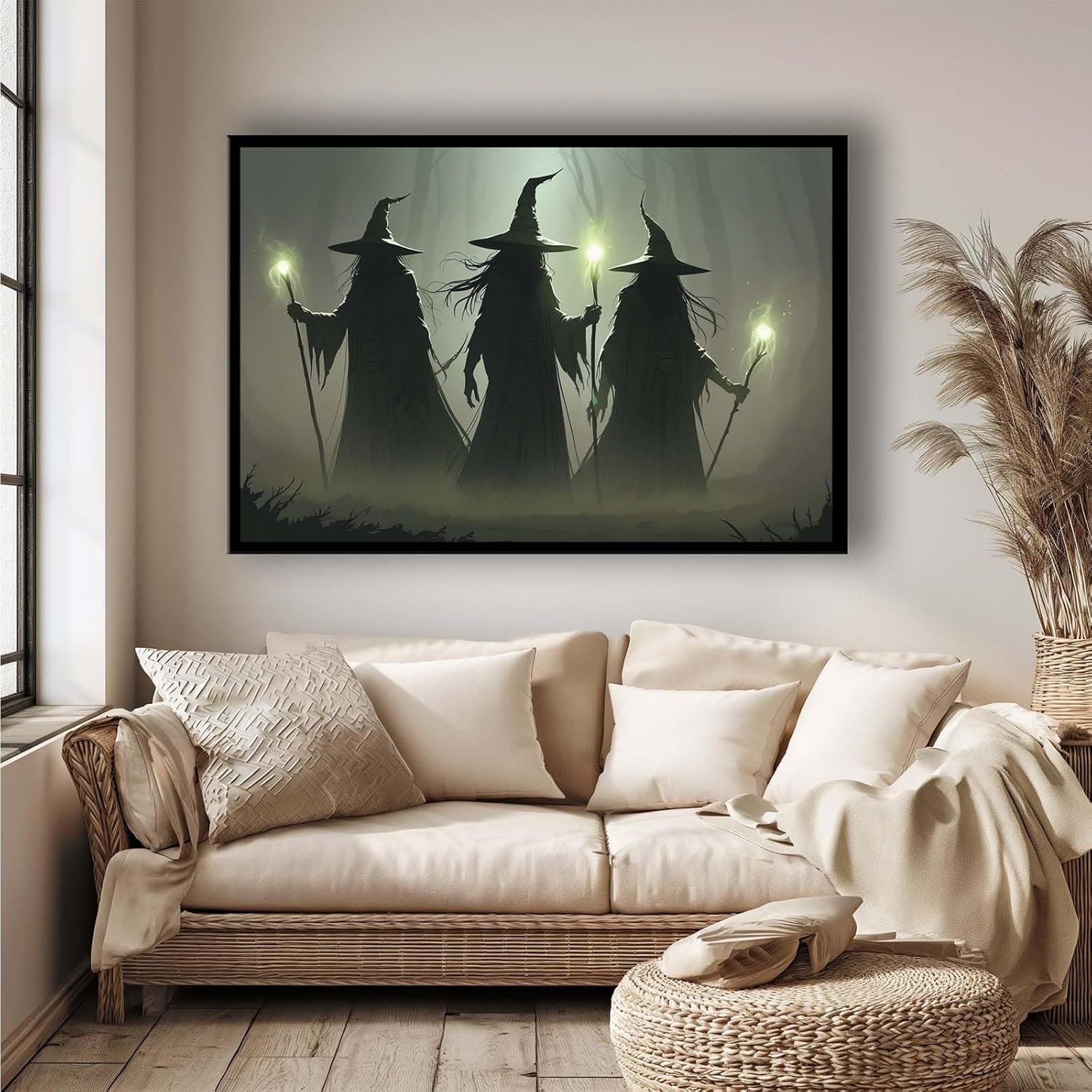 JFHCQJPK Vintage 3 witches canvas wall decor melancholy dark Halloween poster wall decor holding a staff print Gothic horror Halloween painting print for living room bedroom12x16in Metal blackFramed