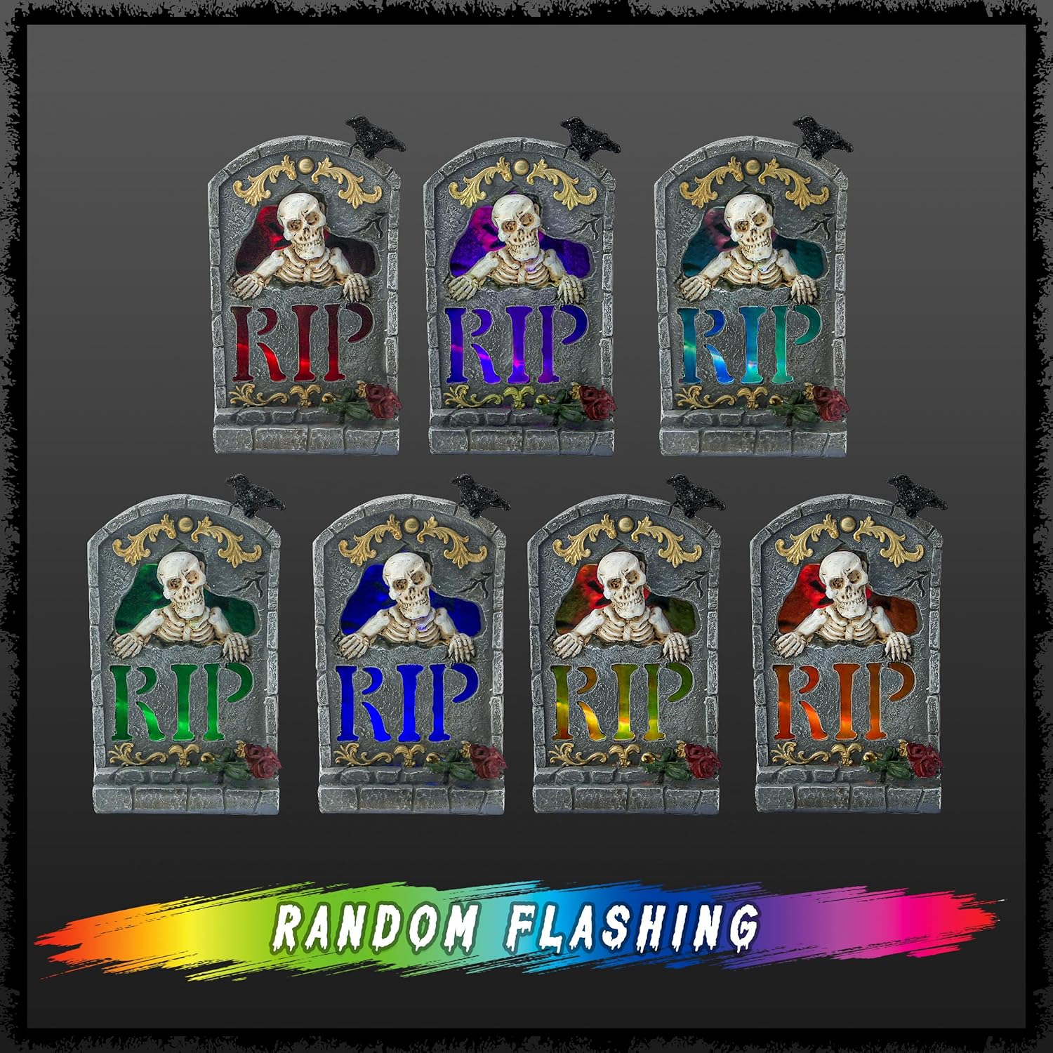 - Scary Design: This gravestone has a skull head and a RIP sign, with a crow standing on top of it. The lights change colors, and the overall design makes you feel scared, like you're in a scary Halloween film