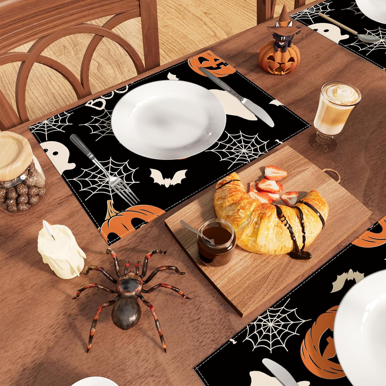 XCHI BOO Spooky Ghost Pumpkin Halloween Cloth Placemats Set of 8 Table Mats Table Decorations 12x18 Inch