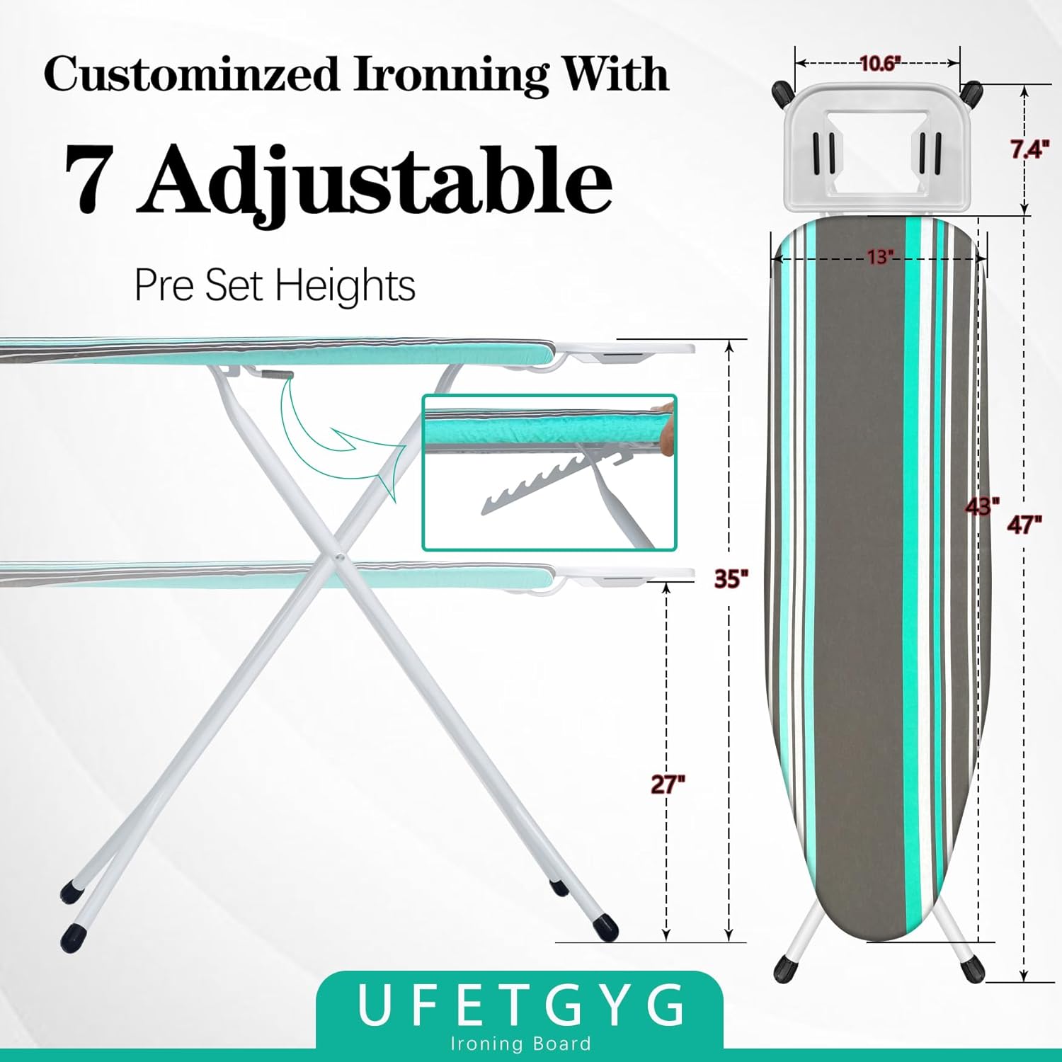 - DIMENSIONS: Full-size ironing board measuring 43 inches long by 13 inches wide with adjustable height for comfortable ironing at any level