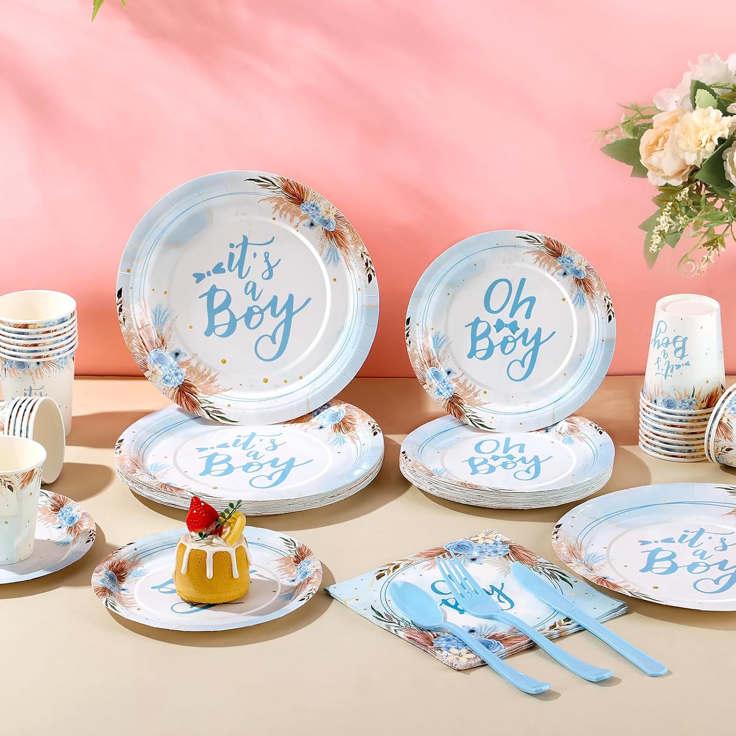 - 【Disposable and Recyclable】 - Baby boy decorations for baby showe are made of 100% food grade paper and are a disposable baby shower dinnerware set, no-toxic. You can simply throw them away when cleaning after the baby shower party. You can enjoy more time with friends and family.