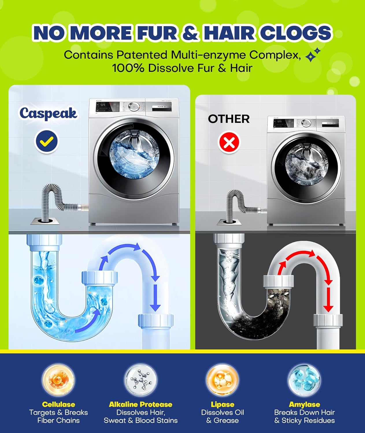 - PESKY FUR? LET OUR ENZYME FORMULA HANDLE IT - Caspeak pet hair dissolver for washing machine contains patented multi-enzyme complex. It targets fiber chains in pet and human hair, breaking them down and 100% dissolving them. Specially made for pet families, Caspeak laundry cleaner dissolves quickly and leaves no chemical residues behind ā safe for both pets and humans. Say goodbye to pet fur clinging to your clothes after every wash!