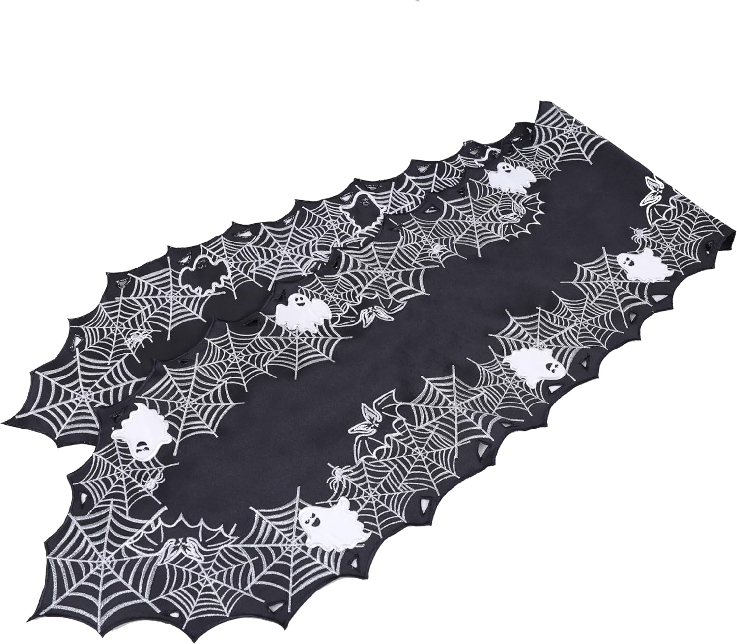 - 🕸️ Halloween Table Runner with Spider Web & Ghost Design – This stylish black Halloween table runner features shimmering silver spiderwebs, white ghost motifs, and black bats, creating the perfect spooky vibe for your Halloween setup