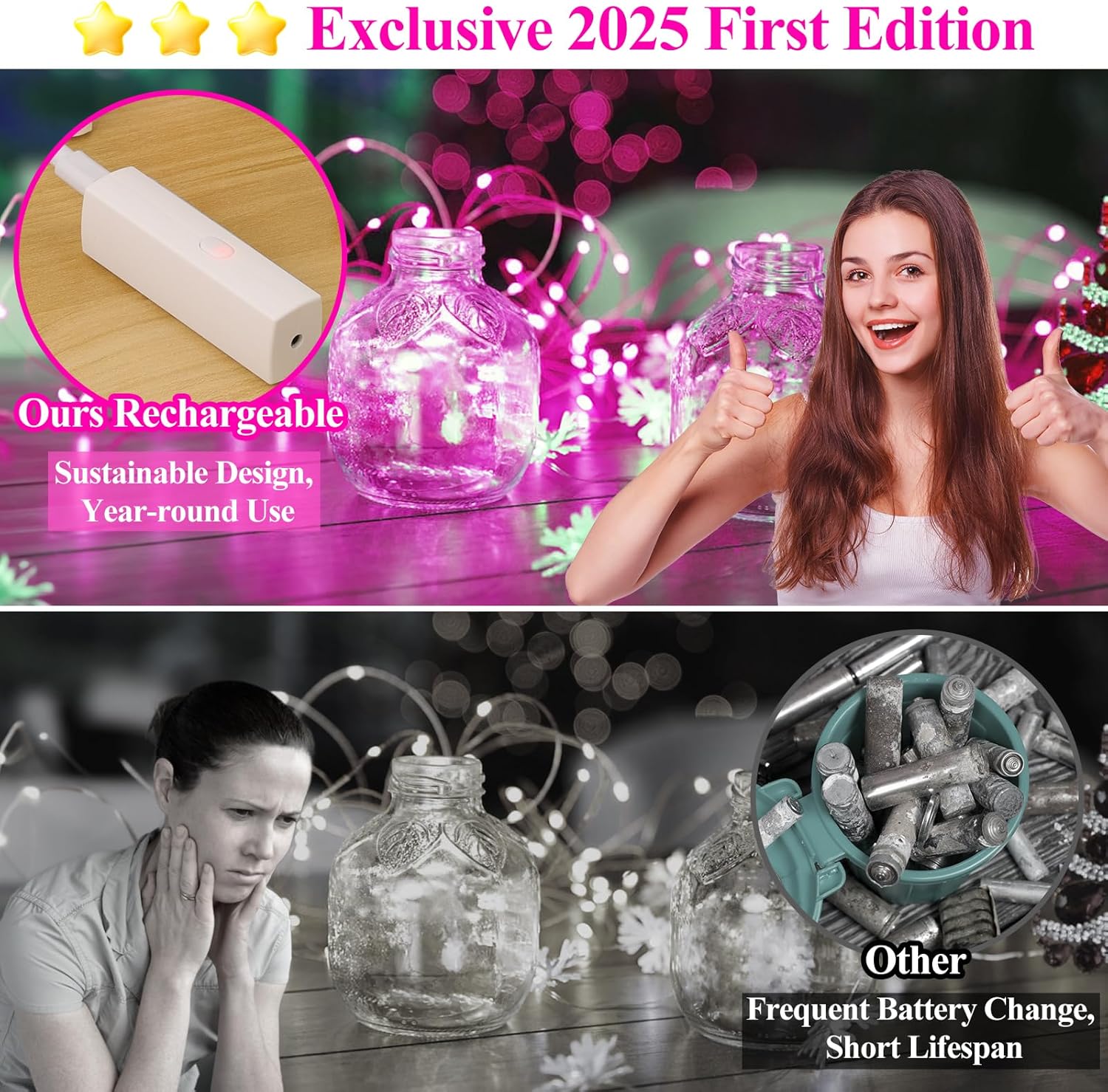 - 2025 Specially Developed Battery Operated String Lights: Say goodbye to disposable batteries and embrace sustainability! Our rechargeable Type-C power bank (cable included) powers the twinkle lights for 30+ hours of cordless glow. When it’s time to recharge, simply detach the compact, lipstick-sized power bank—no need to move the entire string lights. Designed with an innovative, patented structure, this power bank offers a smarter, greener way to shine