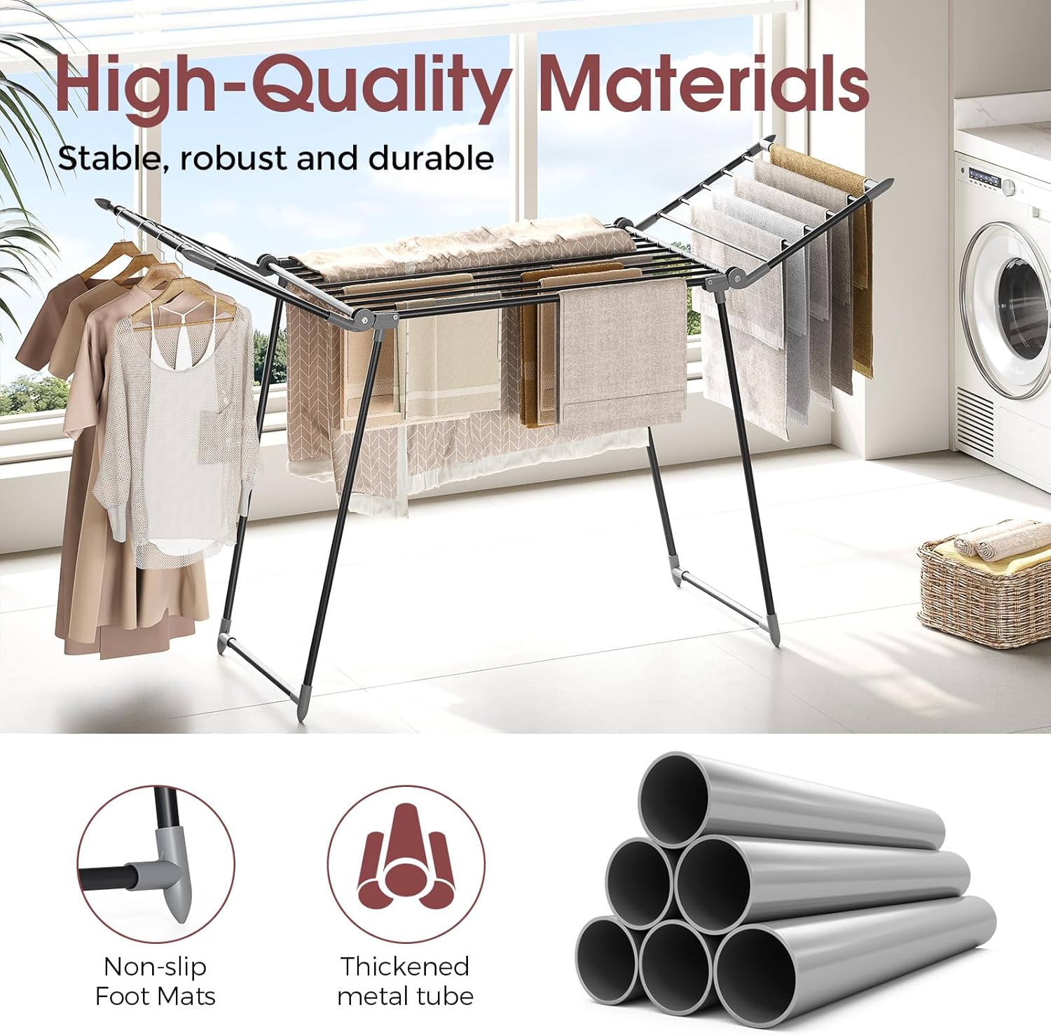 - Premium Built - The foldable dryer rack is made of heavy duty metal and hard plastic to ensure the stability and durability of the drying rack. The coating layer gives the clothes drying rack a rust-free and elegant looks for indoor and outdoor use