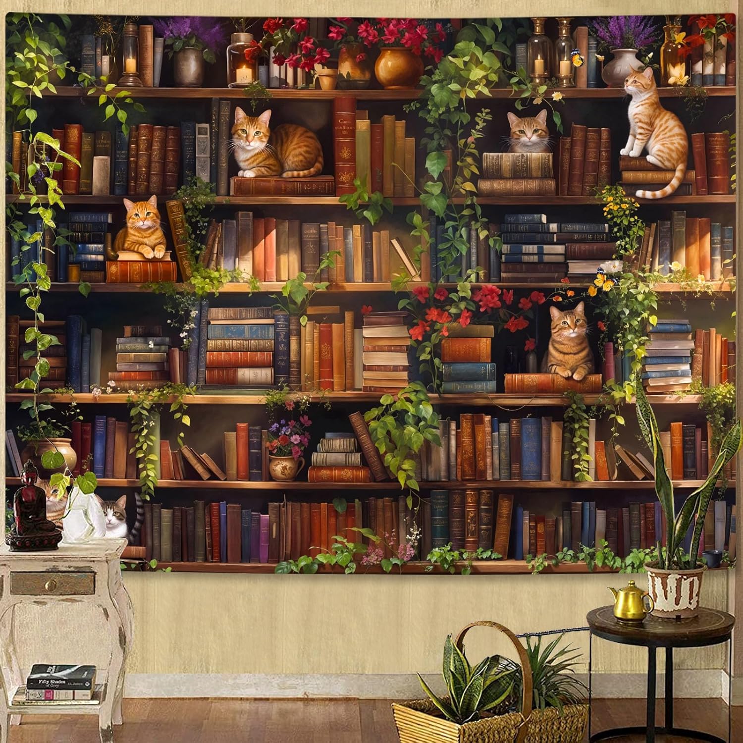 Accnicc Plant Cat Bookshelf Tapestry Botanical Floral Flower Cats Book Tapestries Wall Hanging Vintage Library Small Tapestry for Bedroom Living Room Dorm 60 x 44 inch
