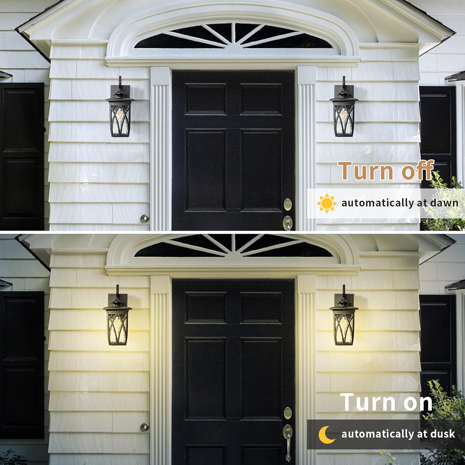 - Dusk-to-Dawn Sensor for Outdoor Wall Lighting – Built-in photocell sensor automatically turns the light on at dusk and off at dawn. Enjoy worry-free, energy-saving operation that lowers your electricity bill and adds daily convenience