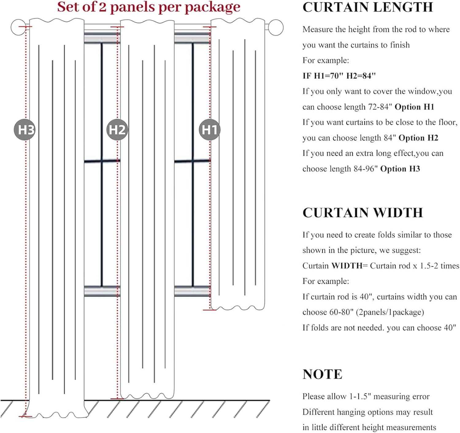 - Ready Made:Set of 2 pinch pleated curtain panels per package with 24 metal rings and 24 adjustable plastic hooks(The adjustable hook can raise and lower the height of the curtain by 1 inch),Each panel measures 70"W x 96"L,pair measures 140"W x 96"L