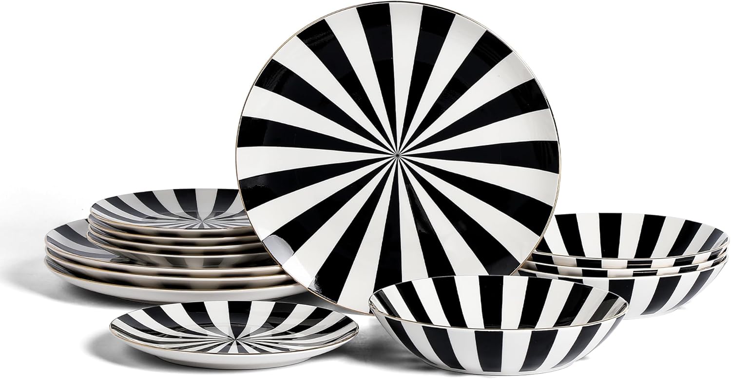 - BLACK AND WHITE: This collection comes available in one striking color combination—a black and white high-end linear pattern runs across each dish, while a contrasting foiled edge adds the perfect hint of gold.