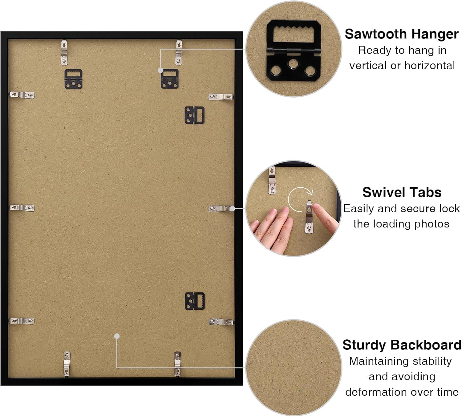 - Load Photos with Ease: The photo frame features flexible swivel tabs design on the back. Simply press and rotate the flexible swivel tabs to easily remove the frame back, allowing for effortless photo replacement