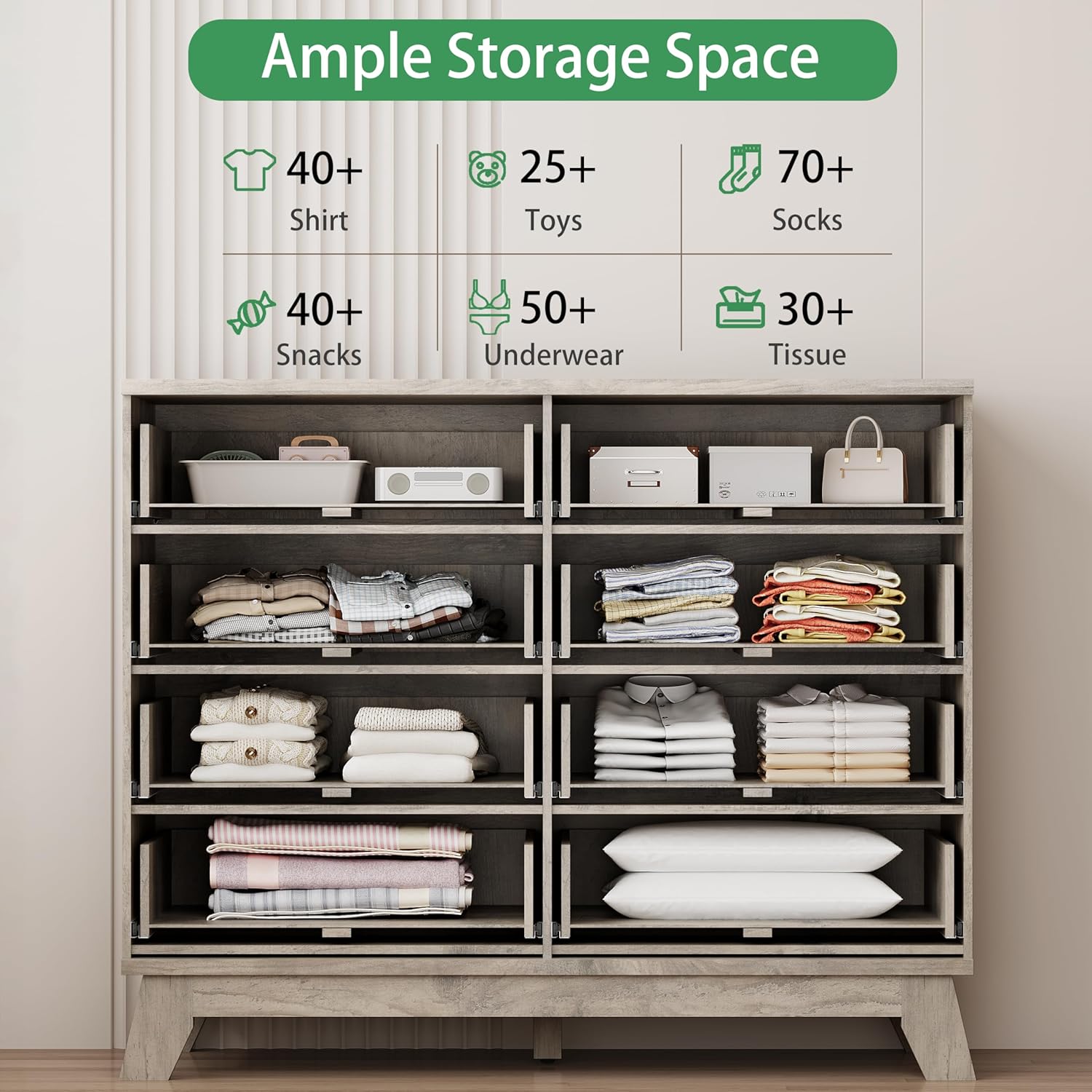 - 【Large Storage Capacity】The dresser for closet features 8 deep drawers that provide plenty of room for organizing clothing, bedding, cosmetics, or jewelry, helping you maintain a neat and tidy space. The wide wooden tabletop can serve as a dresser TV stand or display your decorations such as photo frames, plants or mirrors. Perfect for bedroom, living room, hallway, entryway