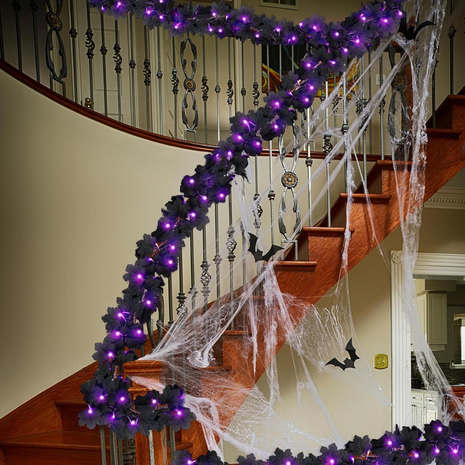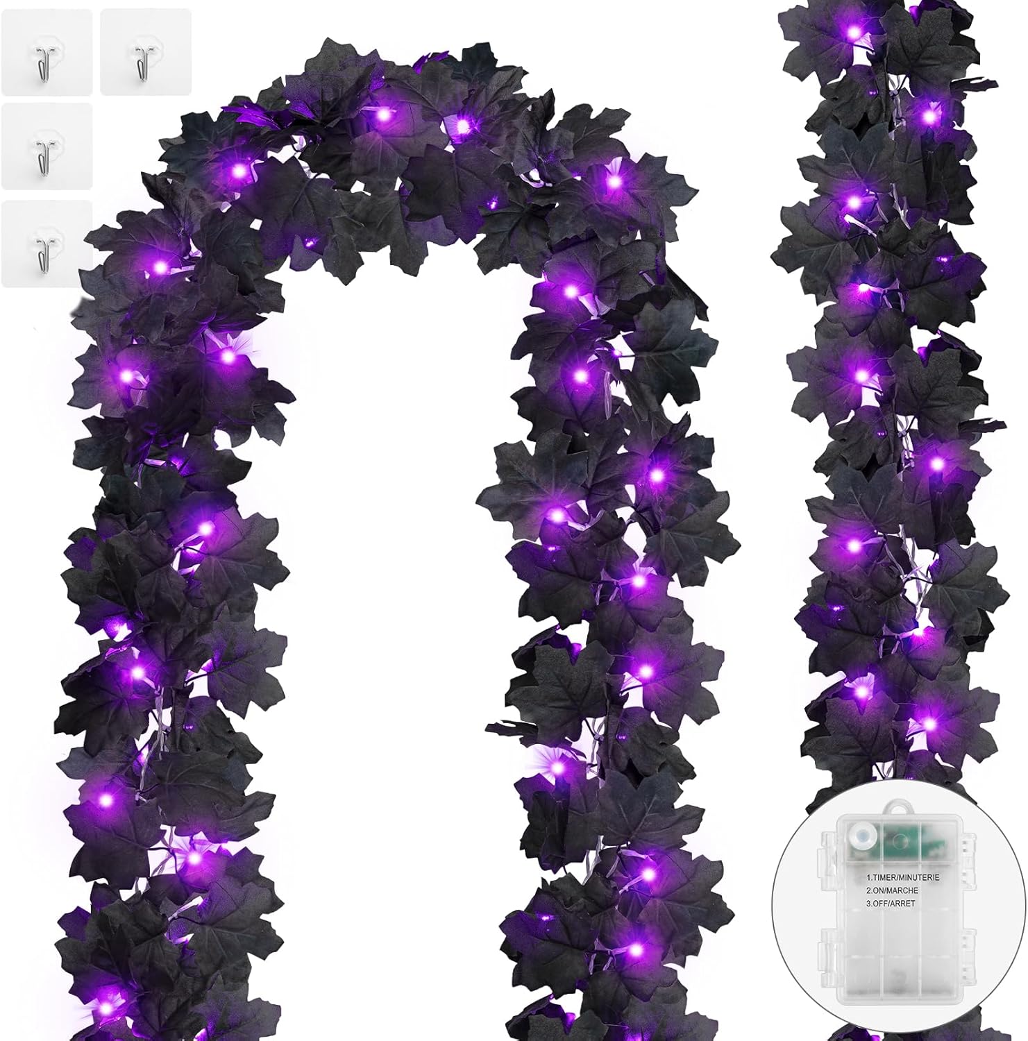 - Package: 2 pack 10 ft lighted black garland; Each garland has 30 purple lights and 60 artificial maple leaves; It can be placed anywhere to shows a mysterious atmosphere, which is definitely a fantastic addition to festival decoration
