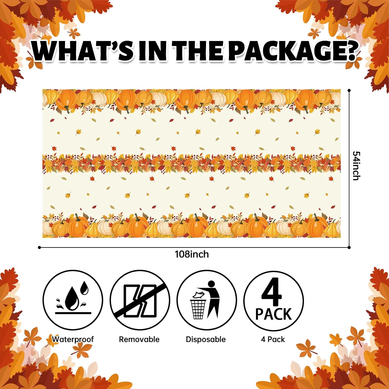 ATFUNSHOP Fall Plastic Tablecloth 4 Packs Thanksgiving Disposable Table Cloth 54x108 Rectangle Table Cover with Pumpkin & Maple Leaf for Holiday Dinner Party Decorations Outdoor Picnic & Baby Showers