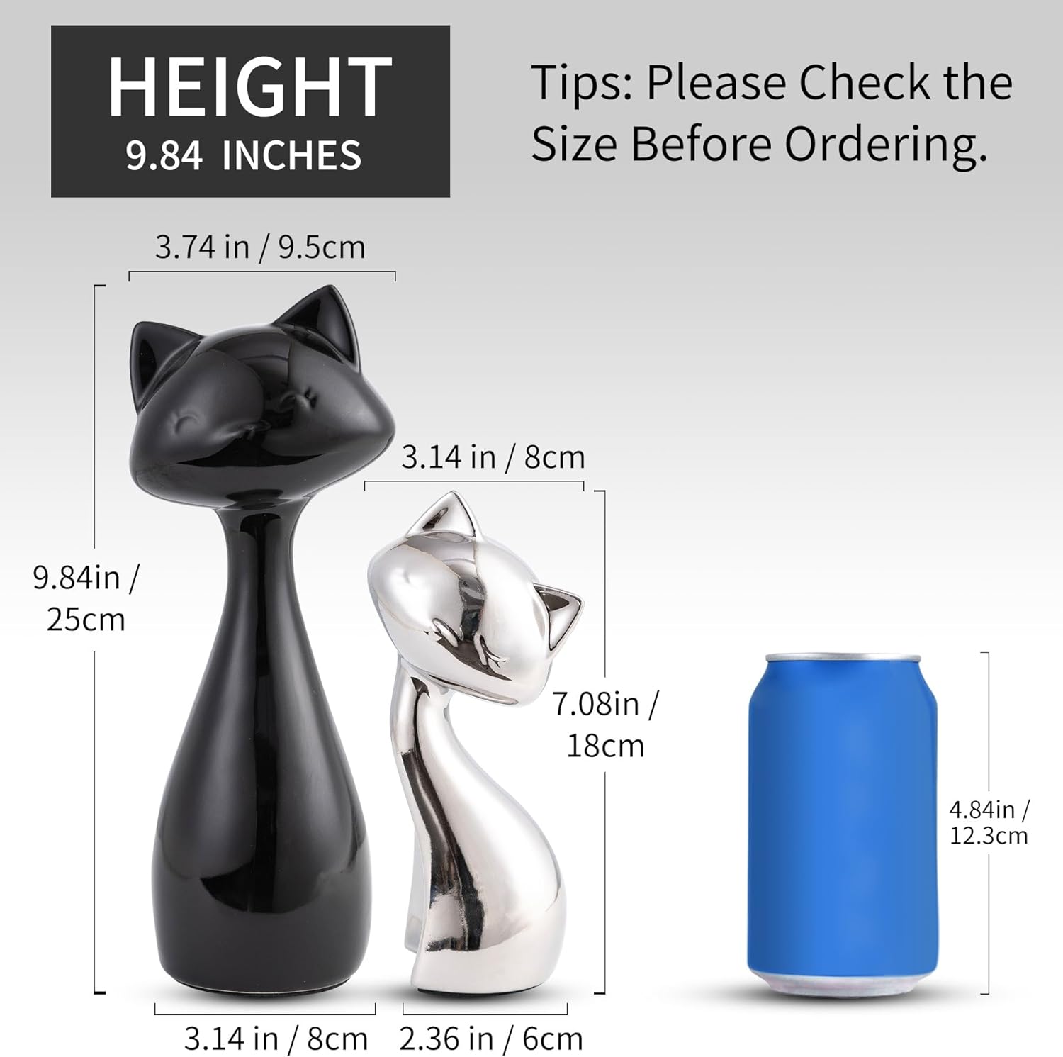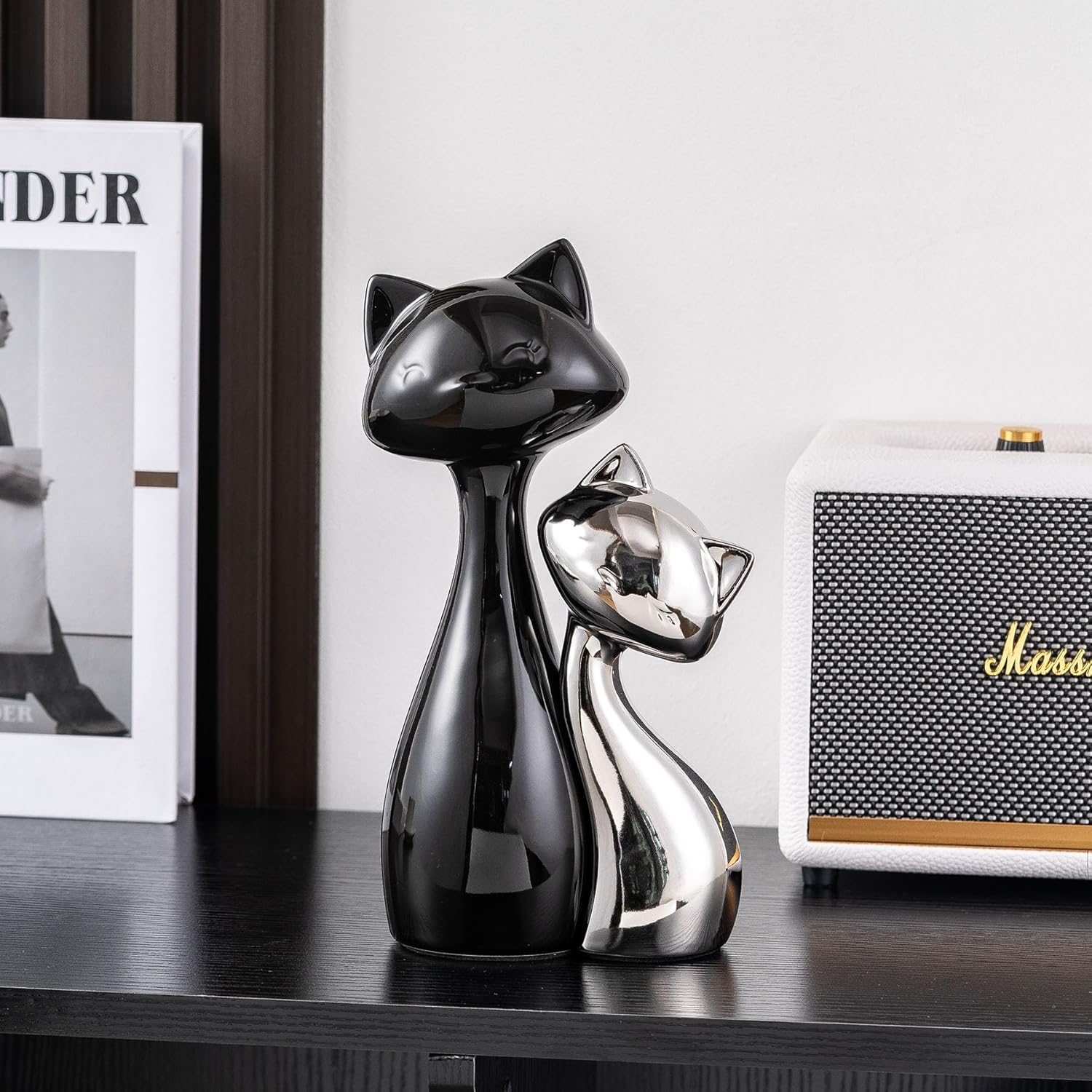 - Elegant Contrast Design: This pair blends glossy black ceramic decor with electroplated silvery accents, creating a mesmerizing modern decor statement. Crafted for cat lovers seeking sophisticated desk decorations or living room focal points, the dynamic black & silver palette elevates any space with artistic feline charm.