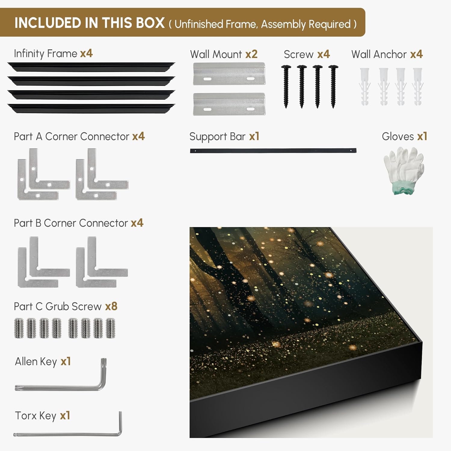 - Assembly Required: The artwork comes with the frame components unassembled. Don’t worry — setup is straightforward and tool-friendly. For best results and accurate alignment, we recommend two people to ensure a smooth assembly and a stable, secure wall mount.