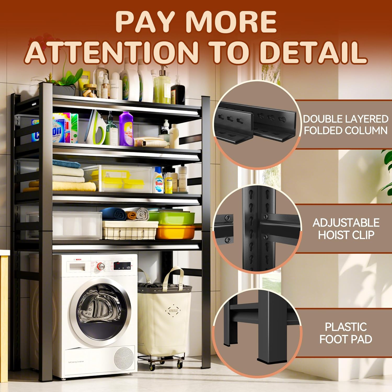 - [Ultimate Laundry Organizer & Spill-Proof Design] Instantly reclaim wasted space with this premium over-the-washer storage shelf. Designed to create 5 tiers of efficient organization, this laundry room organizer features a crucial protective side fence on each shelf, preventing detergents, softeners, and supplies from ever getting knocked over and creating a mess.