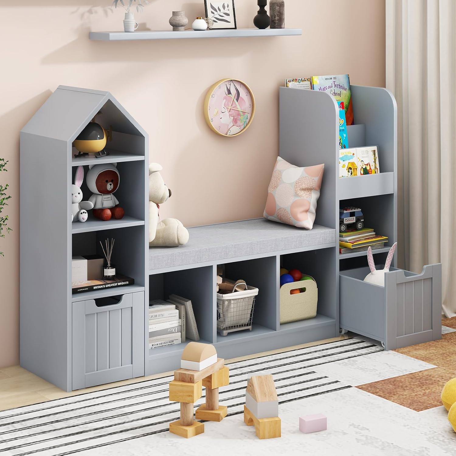 - 🏡【Versatility Storage Flexible Use】Combining the design of kids bookcase and a toy organization, 31.5in large seat can not only satisfy casual reading, but can also serve as a perfect toy storage organizer for living room, bedroom and playroom. Perfect for children's rooms, kindergartens and even schools.