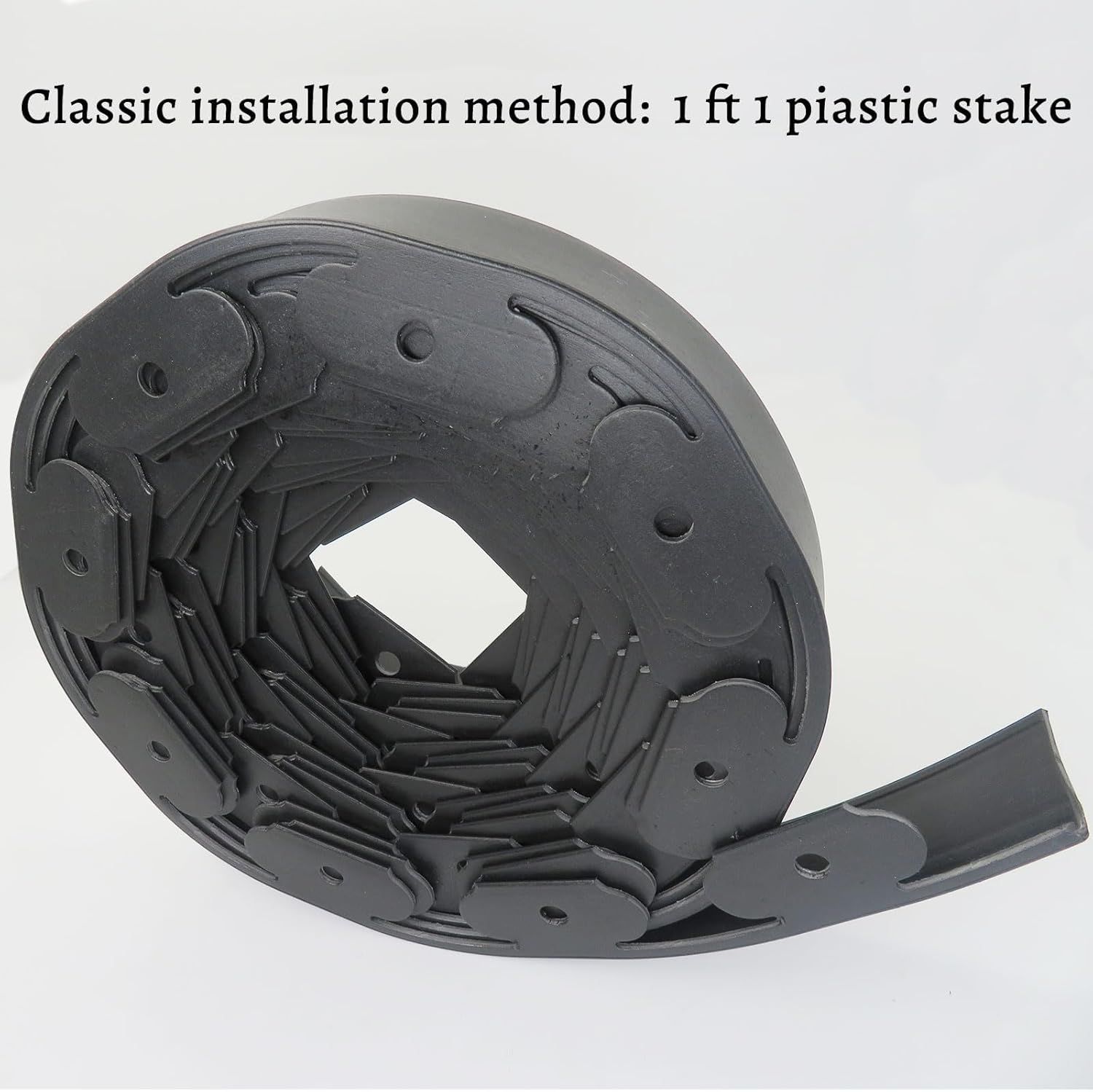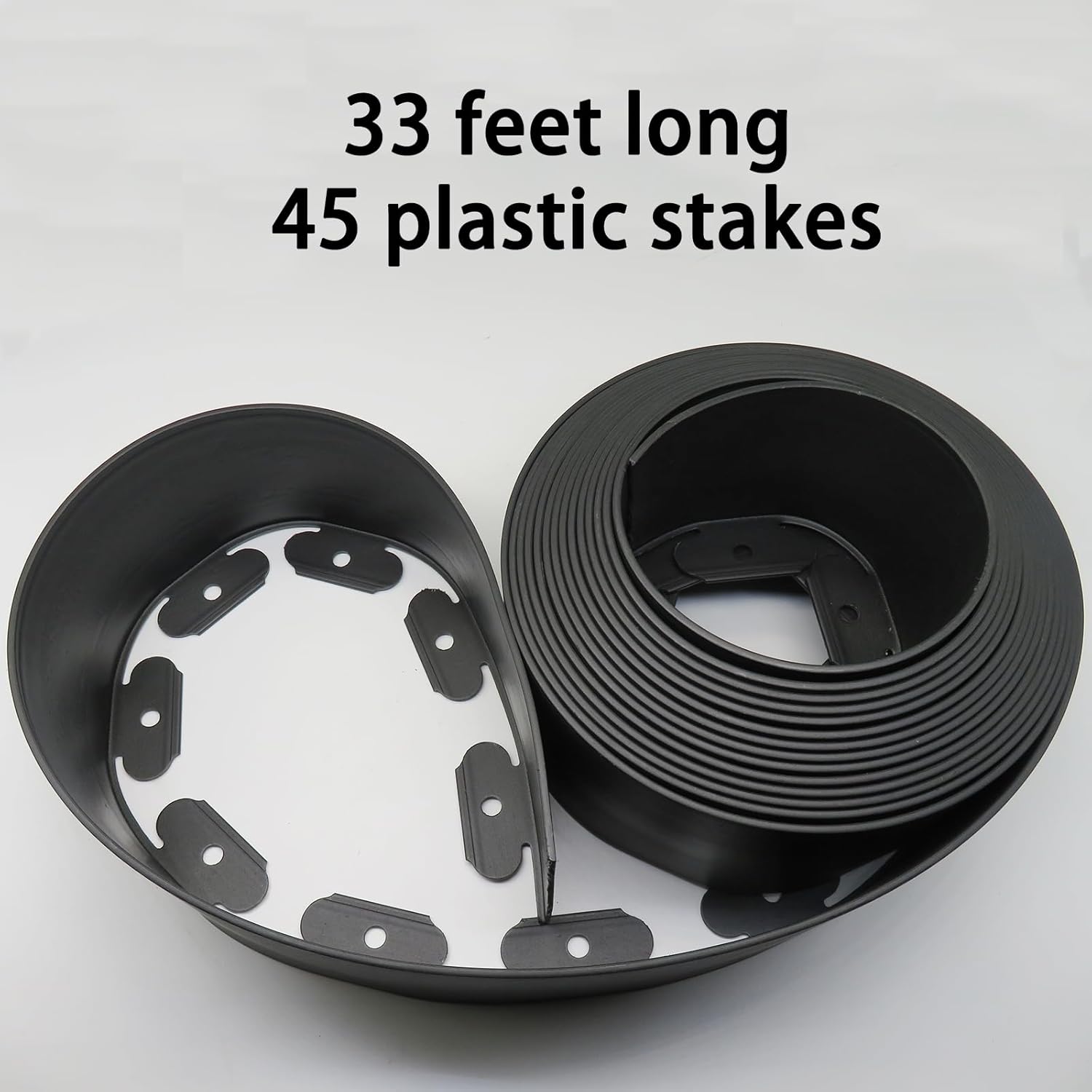 - 【Product Dimensions】The landscape edging border kit,4inch high,black, includes a 33 ft. coil of landscape edging,45pcs plastic stakes,and 1 metal stake. The garden bed border kit are recommended to use 1 spikes per 1ft. to secure the landscape borders.