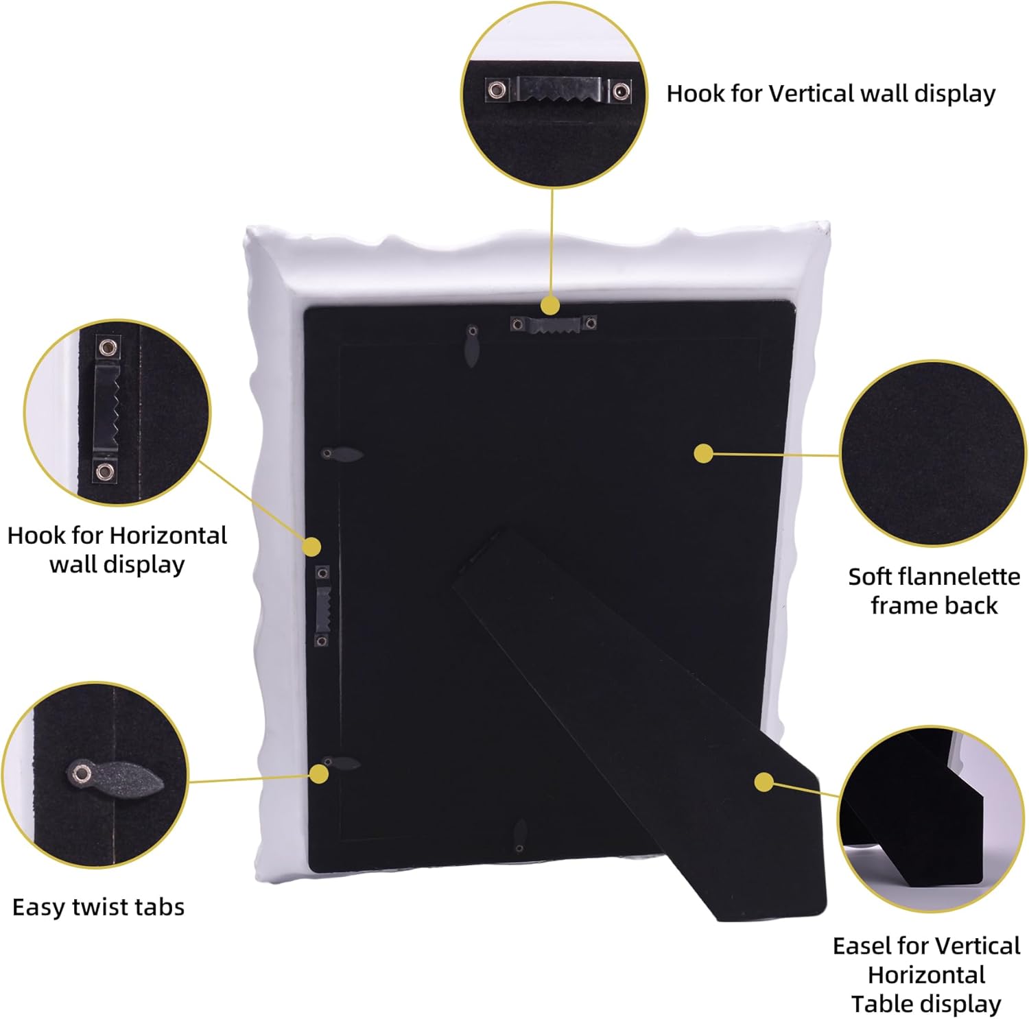 - Easy to Display: This 8x10 white ornate frame comes with a removable white mat and a decor picture. The white mat can be entirely removed for 8x10 paintings or keep it for 5x7 paintings, perfect to display any photos or paintings. The back of frame is a soft velvet back plate equipped with a easel and two-way serrated hook, which can be displayed on tabletop or hang on the wall in vertically or horizontally.