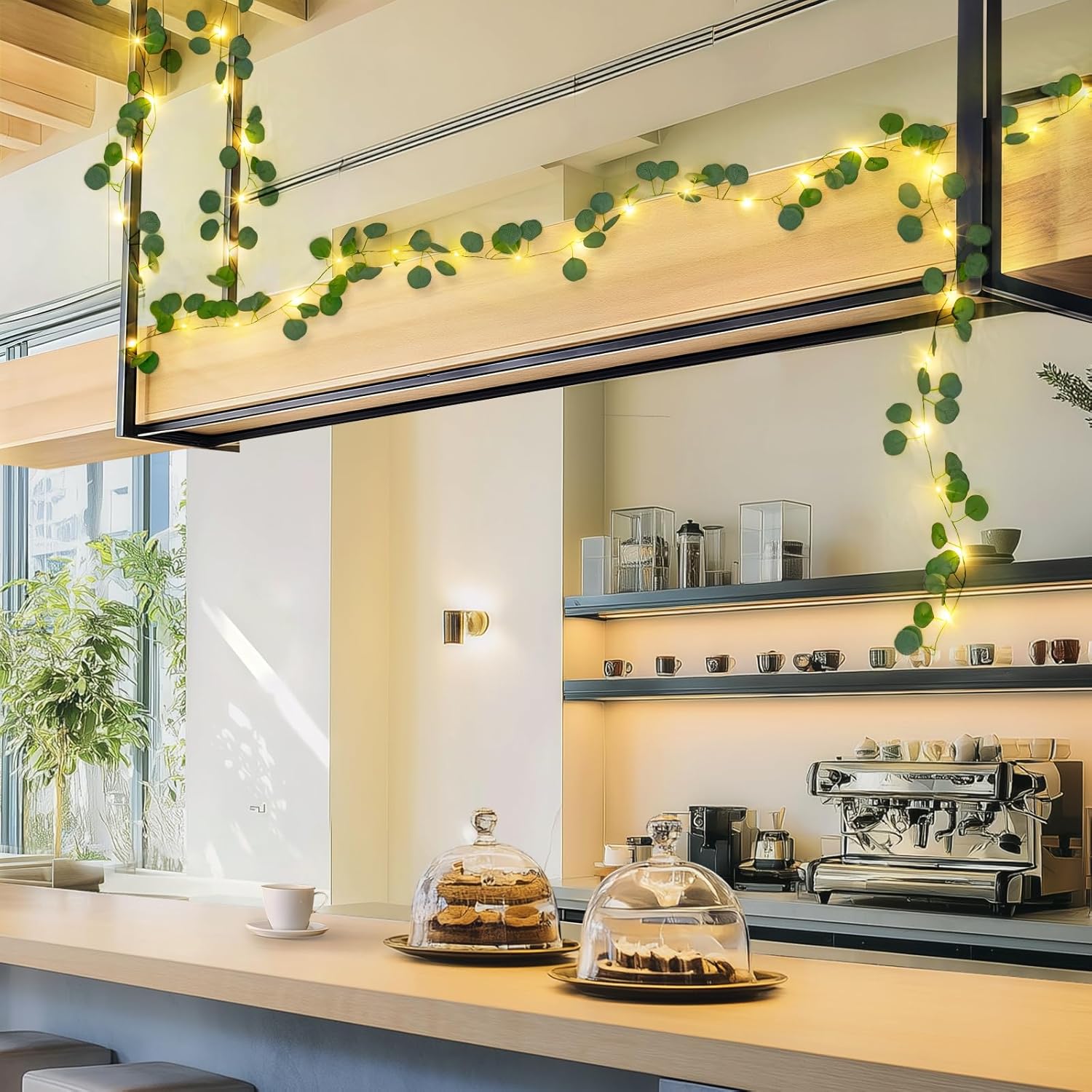 - 100 LED Vines with Lights: The 100 LED vines with lights are designed with Eucalyptus-shaped leaves, integrating eucalyptus leaves vines and fairy lights to save you installation time. The warm light emitted by the vine with lights will add charm to indoor spaces. The lifelike vines with lights enliven and add color to your bedroom, wall, classroom, cafe, tent, fireplace, table shelves Birthday Wedding Party to makes your life vibrant