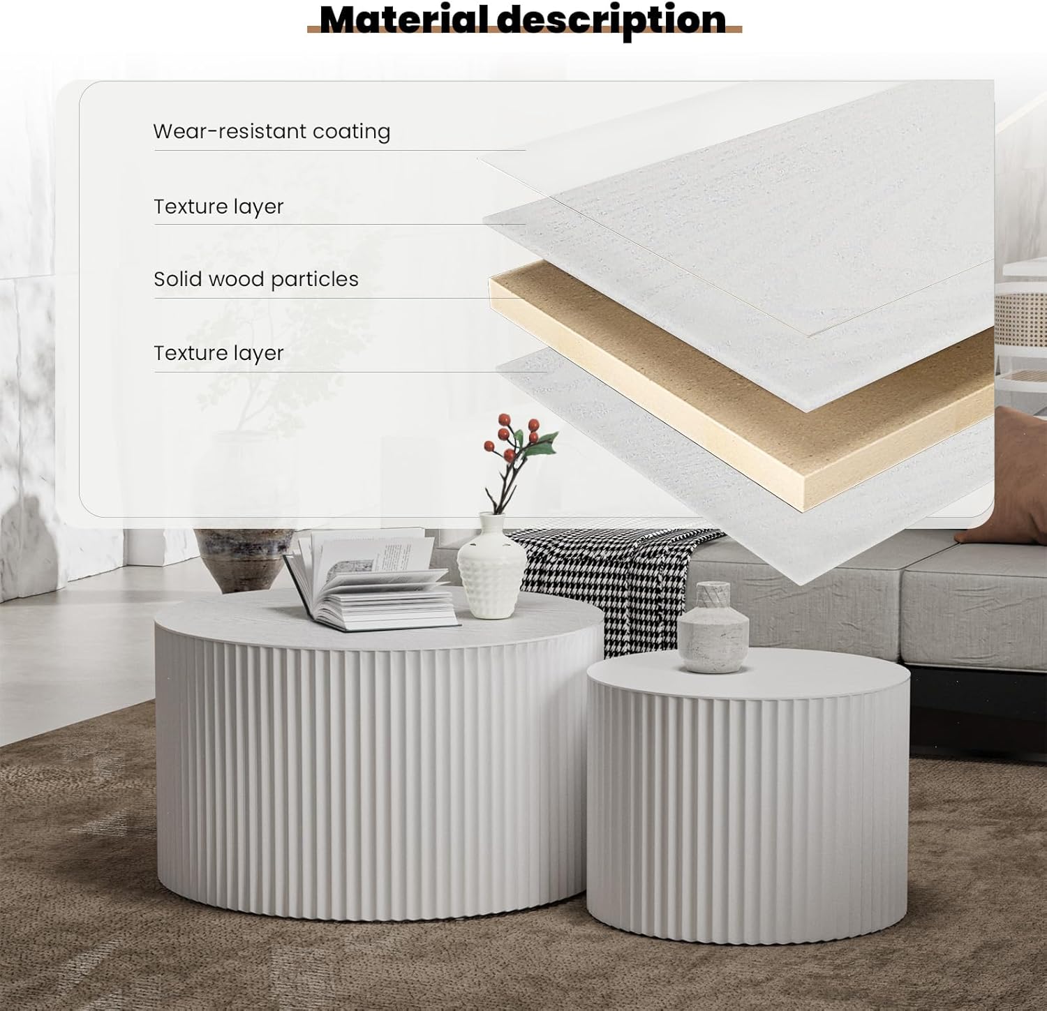- [Timeless Aesthetic, Effortless Elegance] Designed with a sleek round silhouette and a chic beige textured finish, this nesting table set complements modern, industrial, farmhouse, and luxury interiors alike. Round coffee table set of 2 a statement piece that always feels right at home!