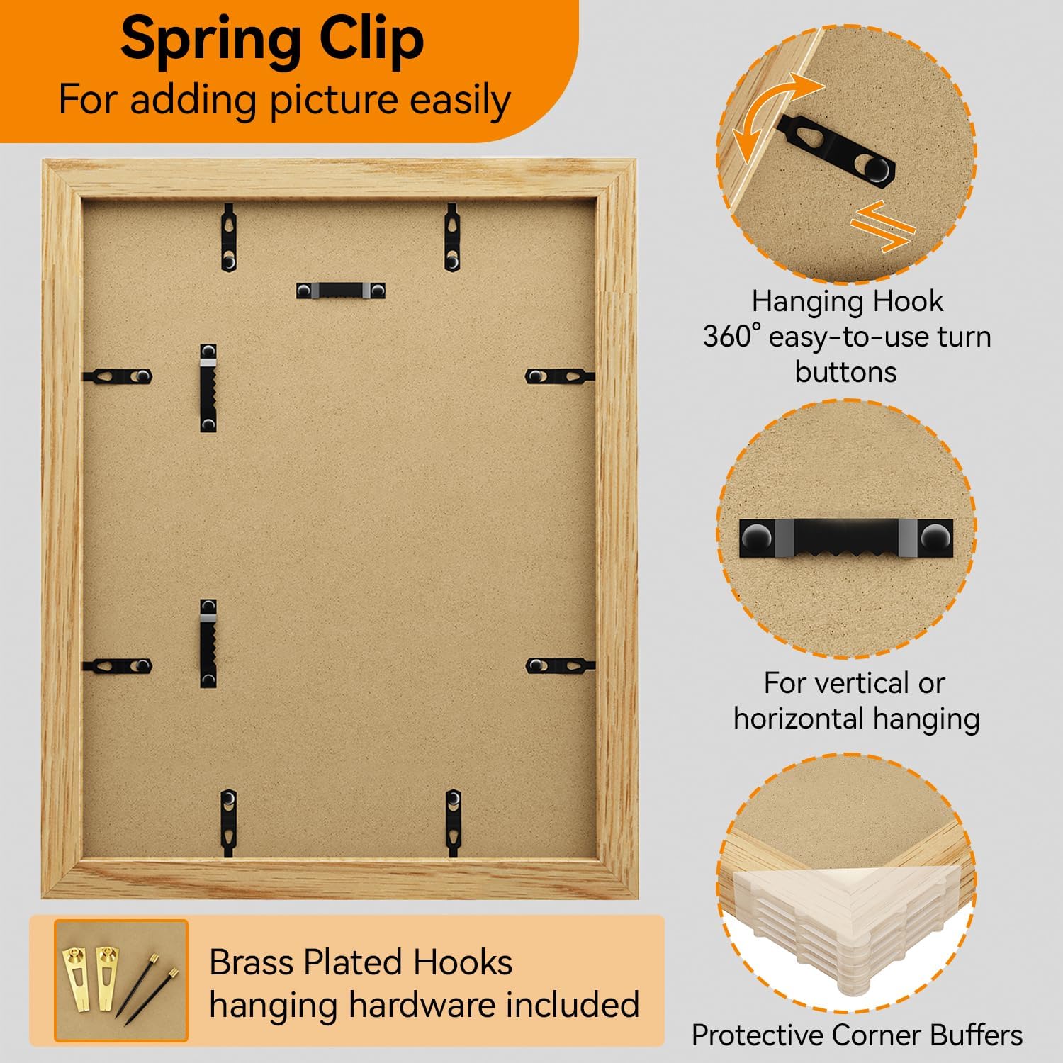 - VERSATILE DISPLAY: Sturdy backboard and versatile hooks allow for horizontal or vertical placement,it creates a cozy atmosphere. Our natural oak poster frames to display your pictures, posters, diplomas and crafts for a stylish home decor.