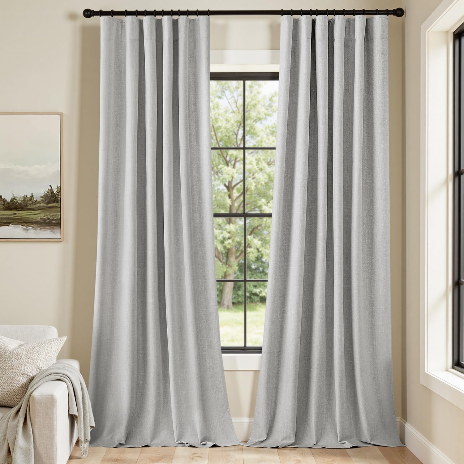 - INNOVATED MATERIAL: Crafted from premium thick linen-like fabric with a substantial weight of 350 GSM, these curtains surpass standard blackout options in thickness, luxurious texture, and functionality. The advanced four-layer coating ensures 100% light blocking, insulation against heat and cold, and effective noise reduction. The vintage burlap texture adds timeless charm and highlights their high-quality feel. Energy-efficient and durable, they provide privacy and a cozy atmosphere year-round