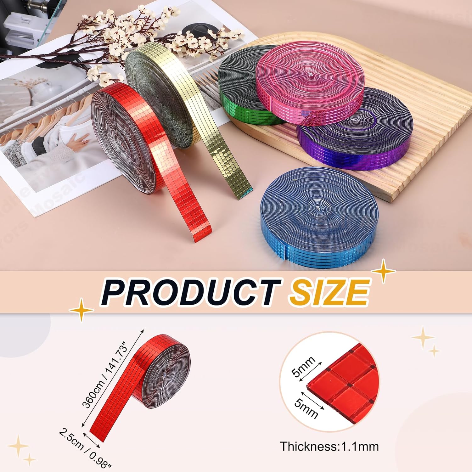 - Specification: Color: Red; Material: Glass; Size:360x2.5cm/141.73x0.98Inch(LxW); Thickness:1.1mm/0.04inch; Each Tile Size: 5x5mm/0.2x0.2inch; Packing List: 3600 Pcs x Self Adhesive Mirrors Mosaic Tiles (Roll of 1)