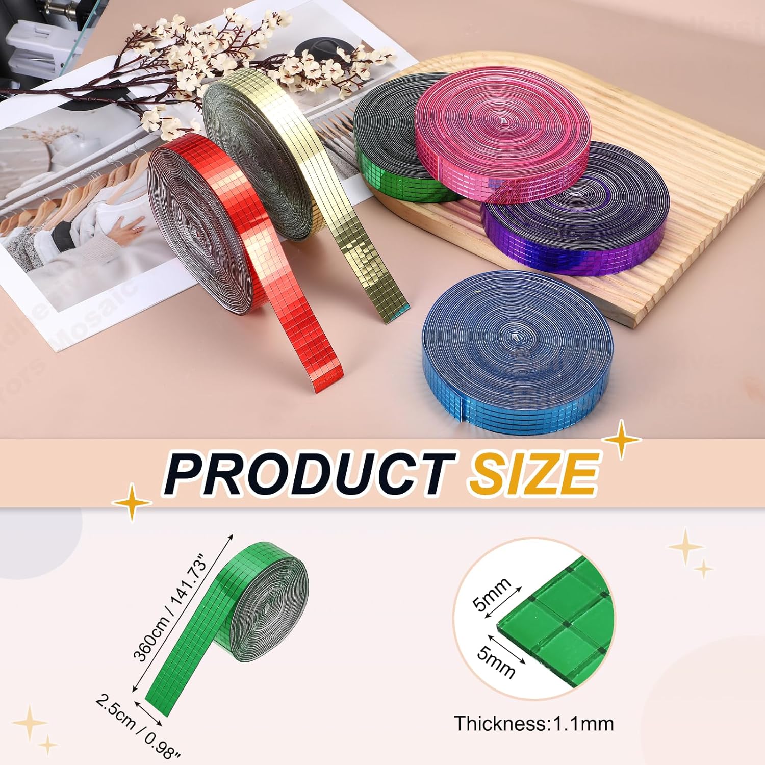 - Specification: Color: Green; Material: Glass; Size:360x2.5cm/141.73x0.98Inch(LxW); Thickness:1.1mm/0.04inch; Each Tile Size: 5x5mm/0.2x0.2inch; Packing List: 3600 Pcs x Self Adhesive Mirrors Mosaic Tiles (Roll of 1)
