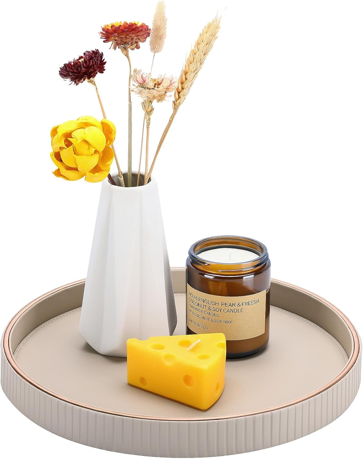 KINGFOM Decorative Serving Tray, PU Leather Valet Nightstand Desk Organizer for Men Women, Round Tray Decor for Coffee Table/Home Decor, Modern Decorative, Centerpiece (Beige)