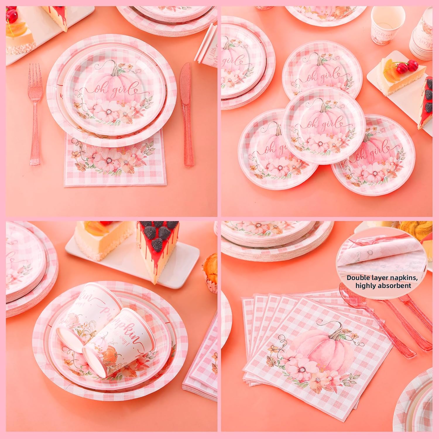 - 【Pumpkin Themed Baby Shower】- A sweet little pumpkin is on the way girl include 24 9 inch pumpkin baby shower plates, 24 7-inch a fall baby shower plates, 24 little pumpkin cups, 24 2-ply little pumpkin napkins, 24 sets of pink plastic utensils (forks, spoons, knives), 168 pieces in total. This is a great fall baby shower plates and napkins sets.