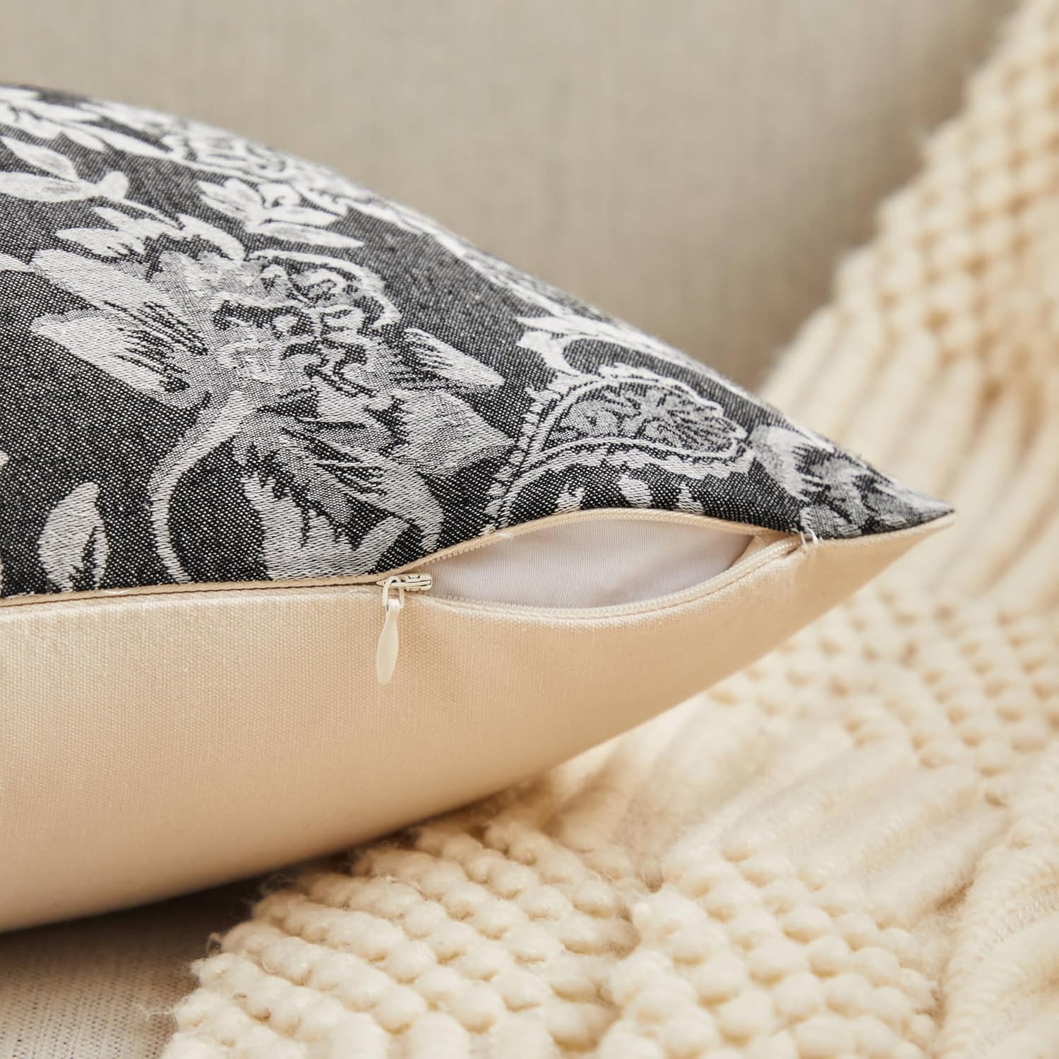 Floral Jacquard Throw Pillow Covers Set of 2, Background/Charcoal 22x22 Inch, Farmhouse Decorative Cotton Dark Grey Cushion Covers for Sofa Bed Living Room Home Decor