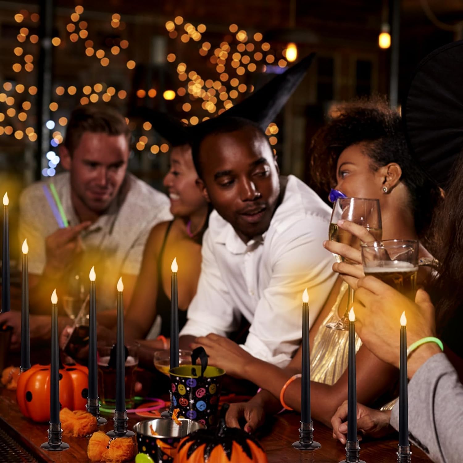 Alphatool 24 Pcs Halloween Black LED Flameless Candles with Bases - Flicker Flame, Tall Taper Smokeless Dripless Candles, Decor for Fireplace Diningtable Bar School