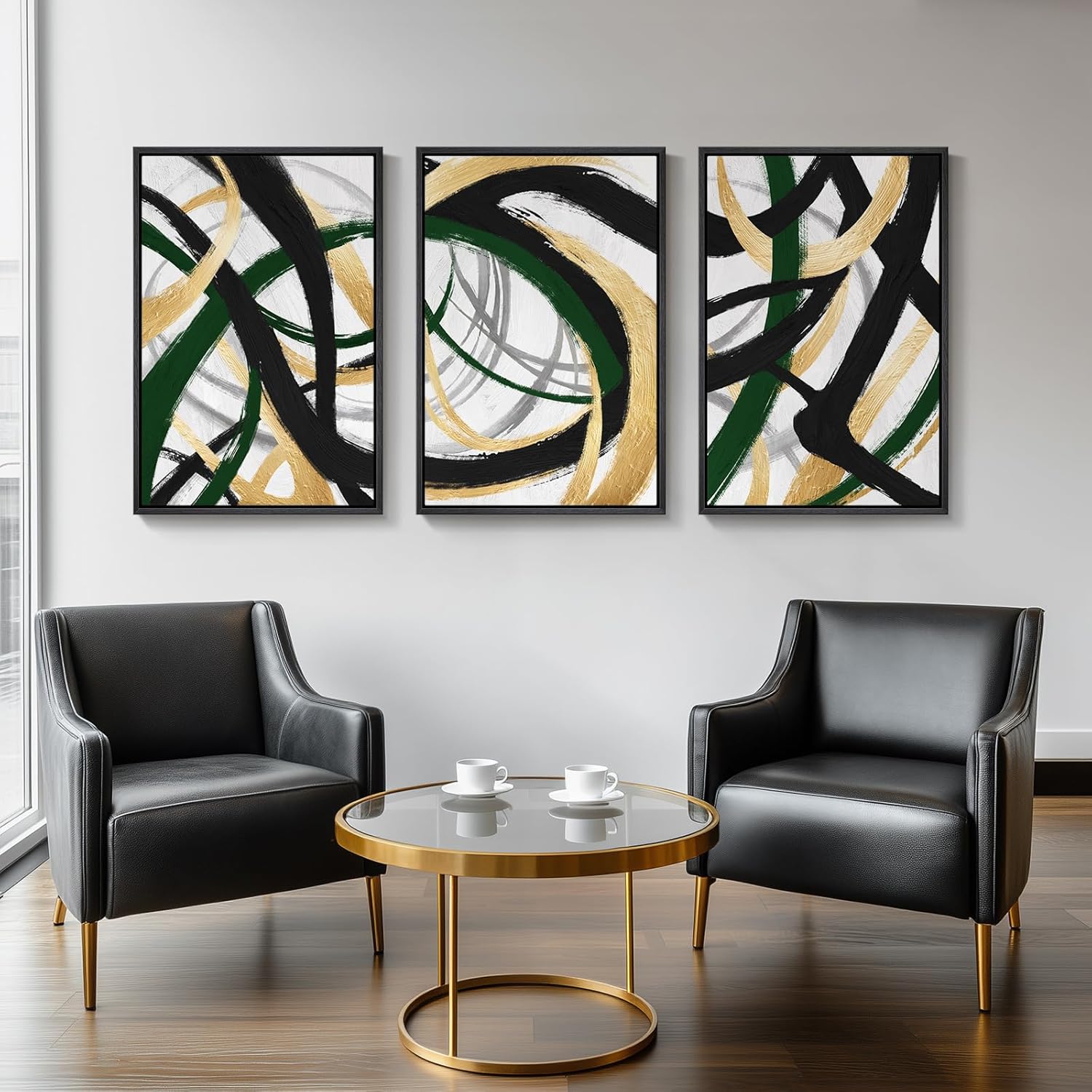 - [Abstract Wall Art]: Modern canvas wall art featuring bold black, green, and gold brush strokes with a contemporary abstract design. This large 3-piece artwork adds a touch of elegance and energy to any living room, bedroom, dining room, office, or hallway. Perfect for modern and minimalist home decor, these framed prints create a striking focal point and elevate your wall decoration with timeless style
