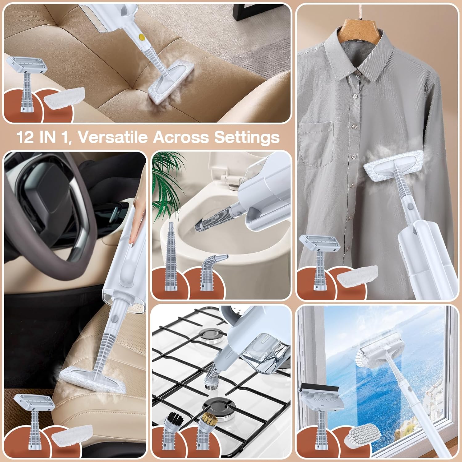 - 10-in-1 Multi-purpose Accessories and 350ml Water Tank: ScrubWiz steamer for cleaning equipped with 10 brush heads and 350ml water tank, steam mop not only simplifies floor and carpet cleaning tasks but can also be used for cleaning windows, clothing creases, gaps, stoves, sofas, and cars, providing a comprehensive cleaning experience