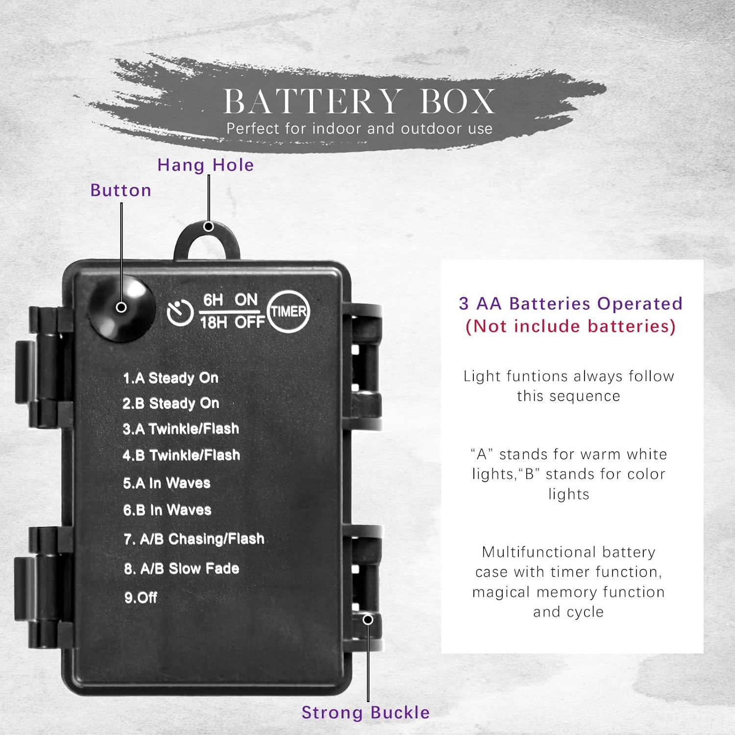 - π PRE-LIT MAGIC - 25 energy-efficient LED lights (warm white + multicolor) with 8 dynamic lighting modes! Battery-powered (3 AA required, not included) and featuring a convenient timer button for instant, mesmerizing ambiance. Cast a spellbinding glow for trick-or-treaters or set a playful party mood.