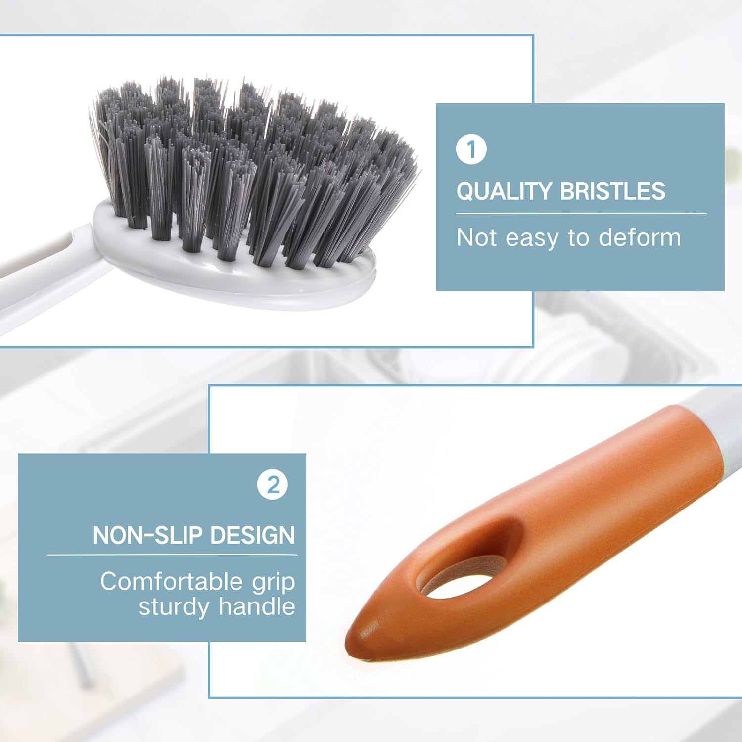 - Non Slip Handle: with a non slip handle, the dish scrubber ensures a firm grip, preventing slips during use; The expertly design also keeps your hands clean and dry, turning chores into pleasant, efficient tasks, whether you're using a dish brush for kitchen tasks or a more intensive scrub