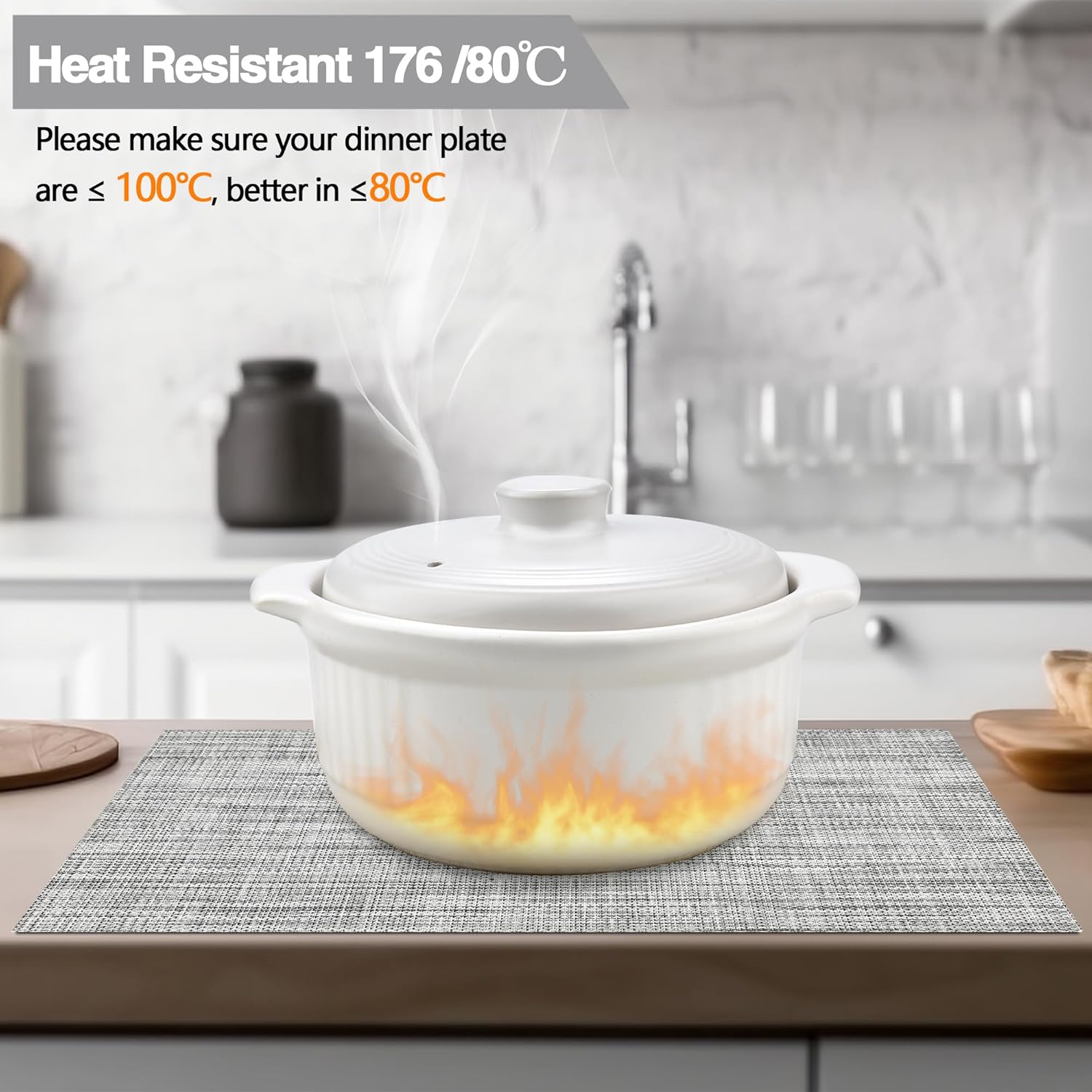 - Heat Resistant: Please make sure your dinner plate are β€ 100β, better in β€80β. It can prevent the table from slipping and scalding the countertop. These beautiful stylish vinyl place mats to add more fun to your dining table