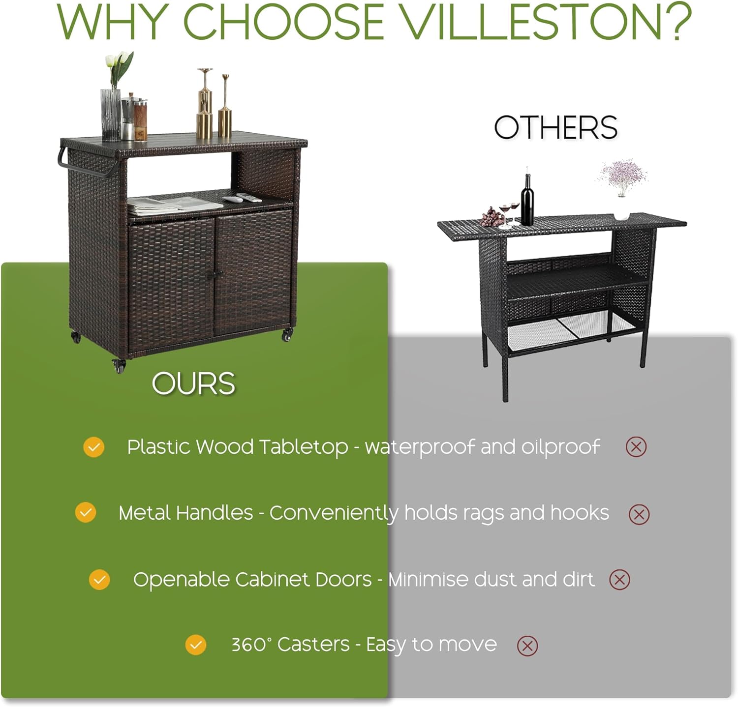 - GREAT STORAGE SPACE: Our patio cabinets is designed to be adaptable. It has a spacious tabletop, an open shelf and a closed cabinet, providing plenty of space for efficient organisation and easy access