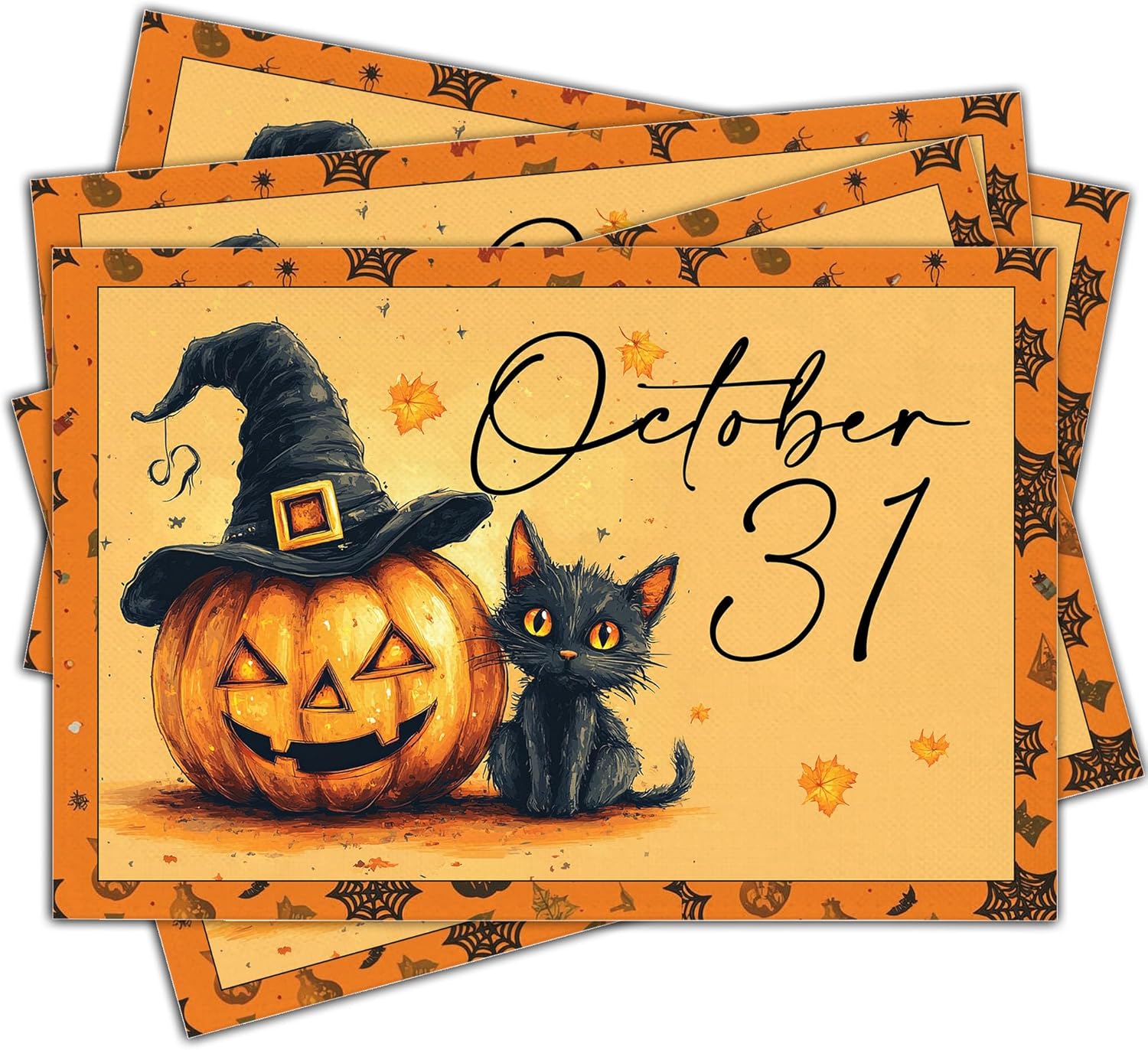 Halloween Pumpkin Placemats Set of 4, 12x18 Inch Pumpkin and Black Cat Table Mat, Washable Heat Resistant Place Mats for Kitchen Dining Table, Spooky Themed Decoration for Home-B09