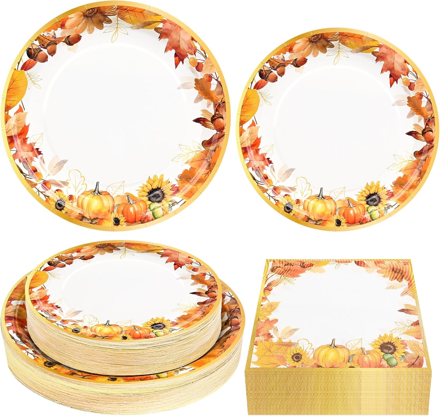 - Fall Paper Plates and Napkins---Complete set with 9" thanksgiving maple leaves plates *50, 7" fall paper plates *50,6.5" napkins *50,serve 50 guests. Sufficient quantity can meet your fall party decor thanksgiving party supplies needs and also enough for party usage needs, your guests will love decorative disposable plates