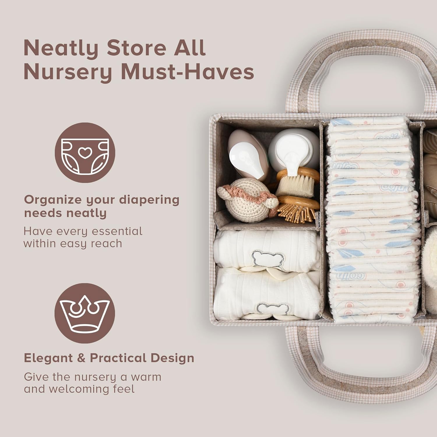 - MAXIMIZE STORAGE SPACE: Our 16x10x7 inch baby diaper caddy organizer holds all nursery must-haves—diapers, wipes, baby bath items, and mom essentials. Use it as a baby bath caddy, changing table organizer, or newborn gift basket for new moms.
